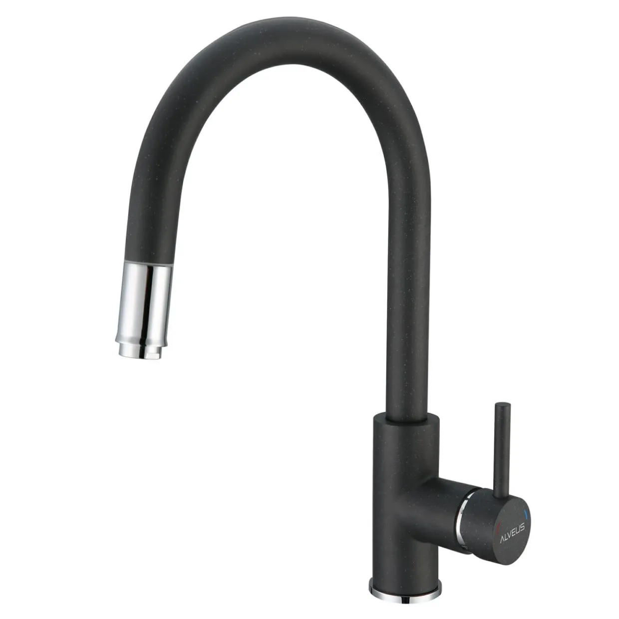 - Zestaw baterię PLAY z nowoczesnym modelem czarnego, granitowego zlewozmywaka.