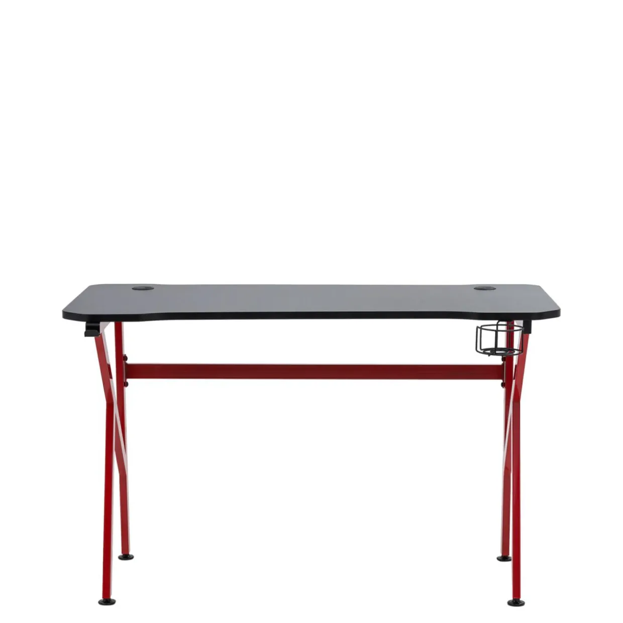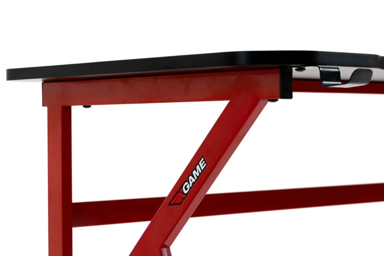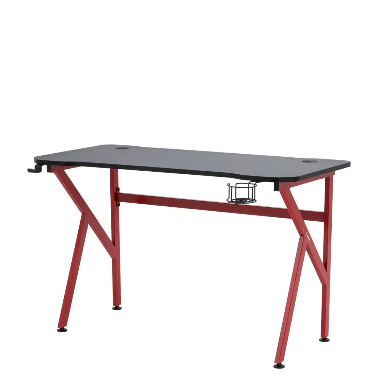 - Podstawą biurka są metalowe nogi. Taka konstrukcja zapewnia dużo miejsca pod blatem, a czerwone wykończenie tworzy nowoczesny kontrast z blatem i urozmaica pomieszczenie.