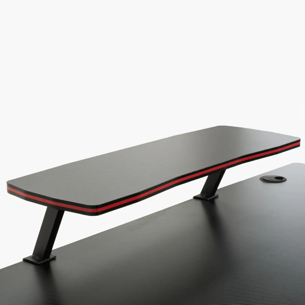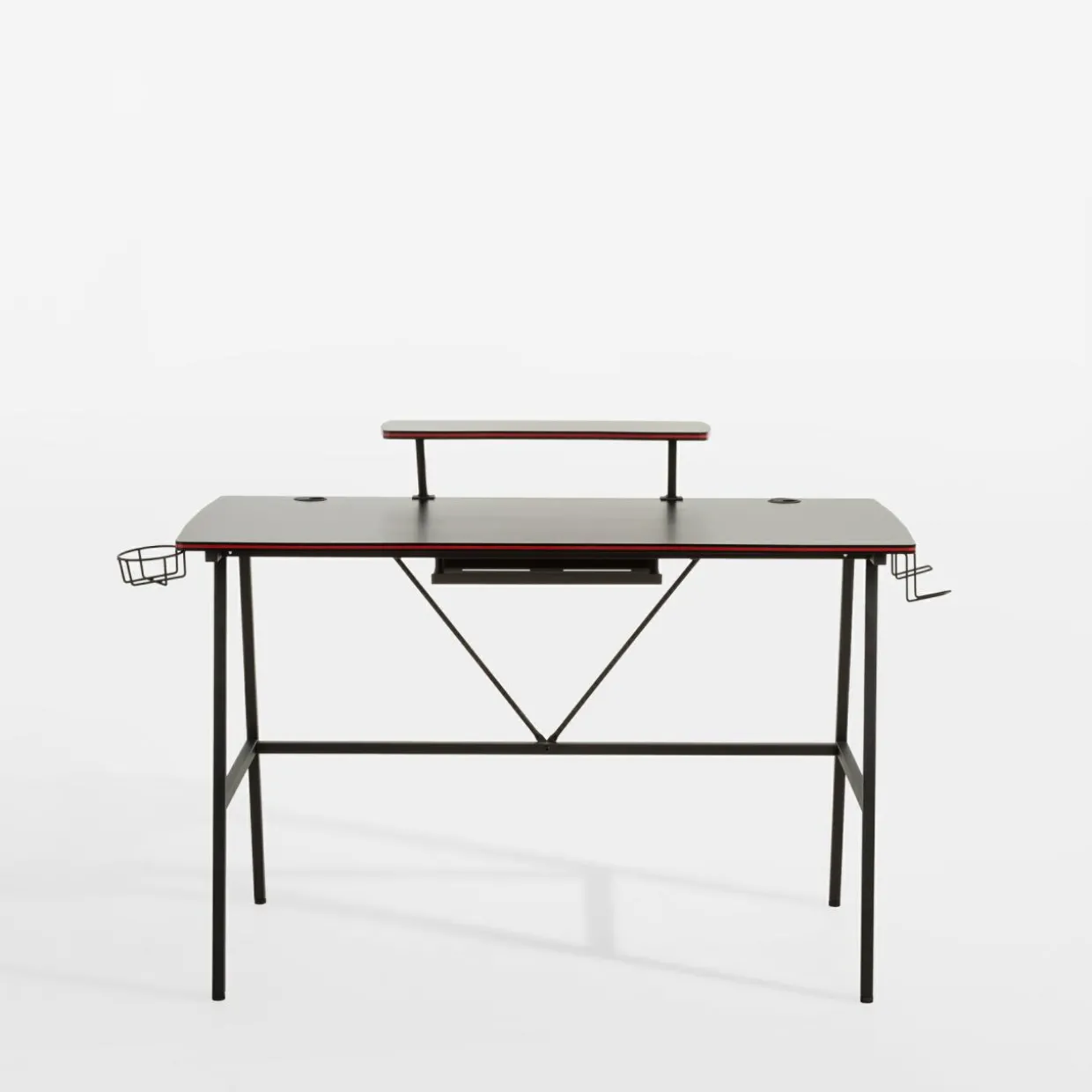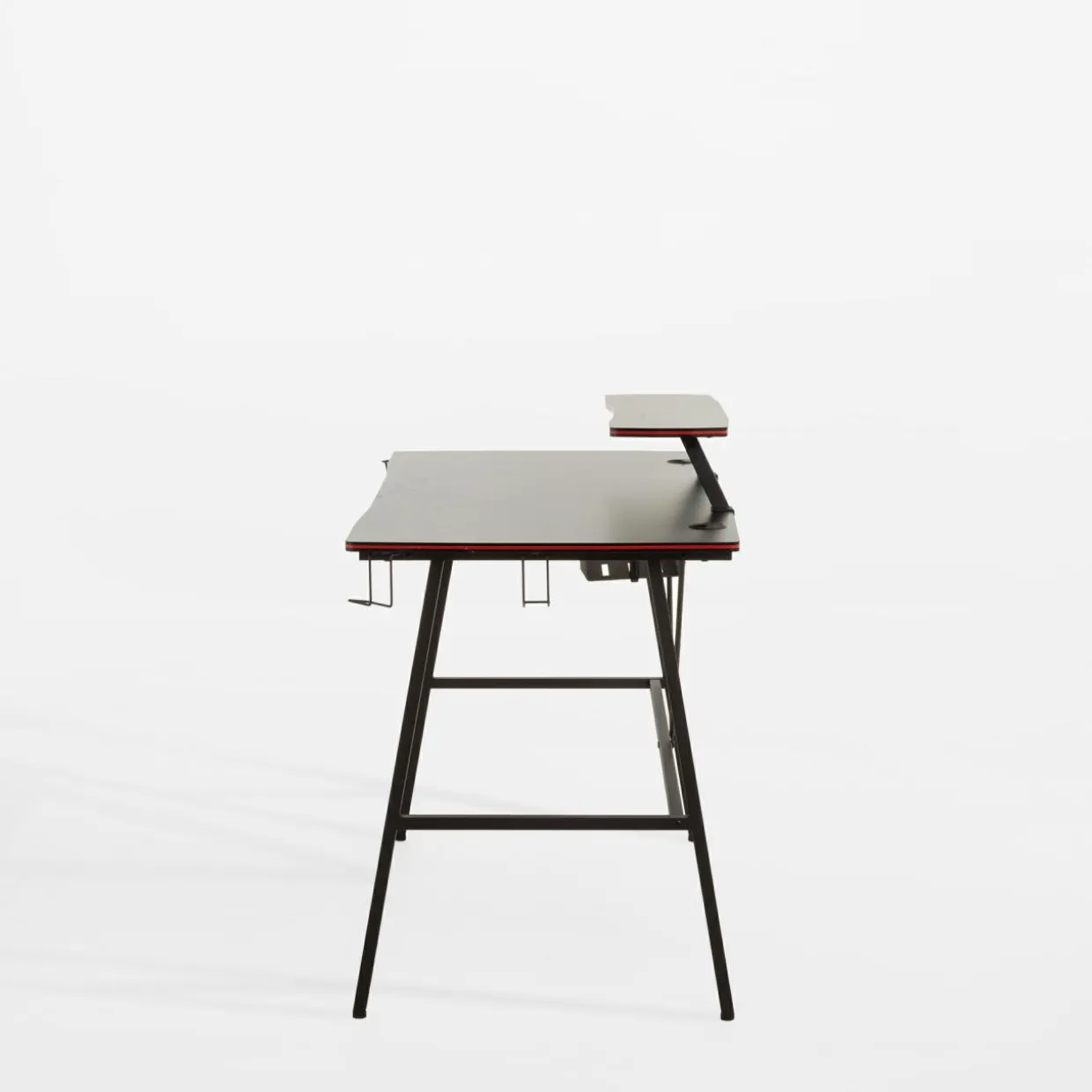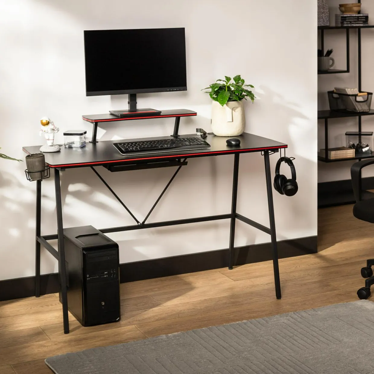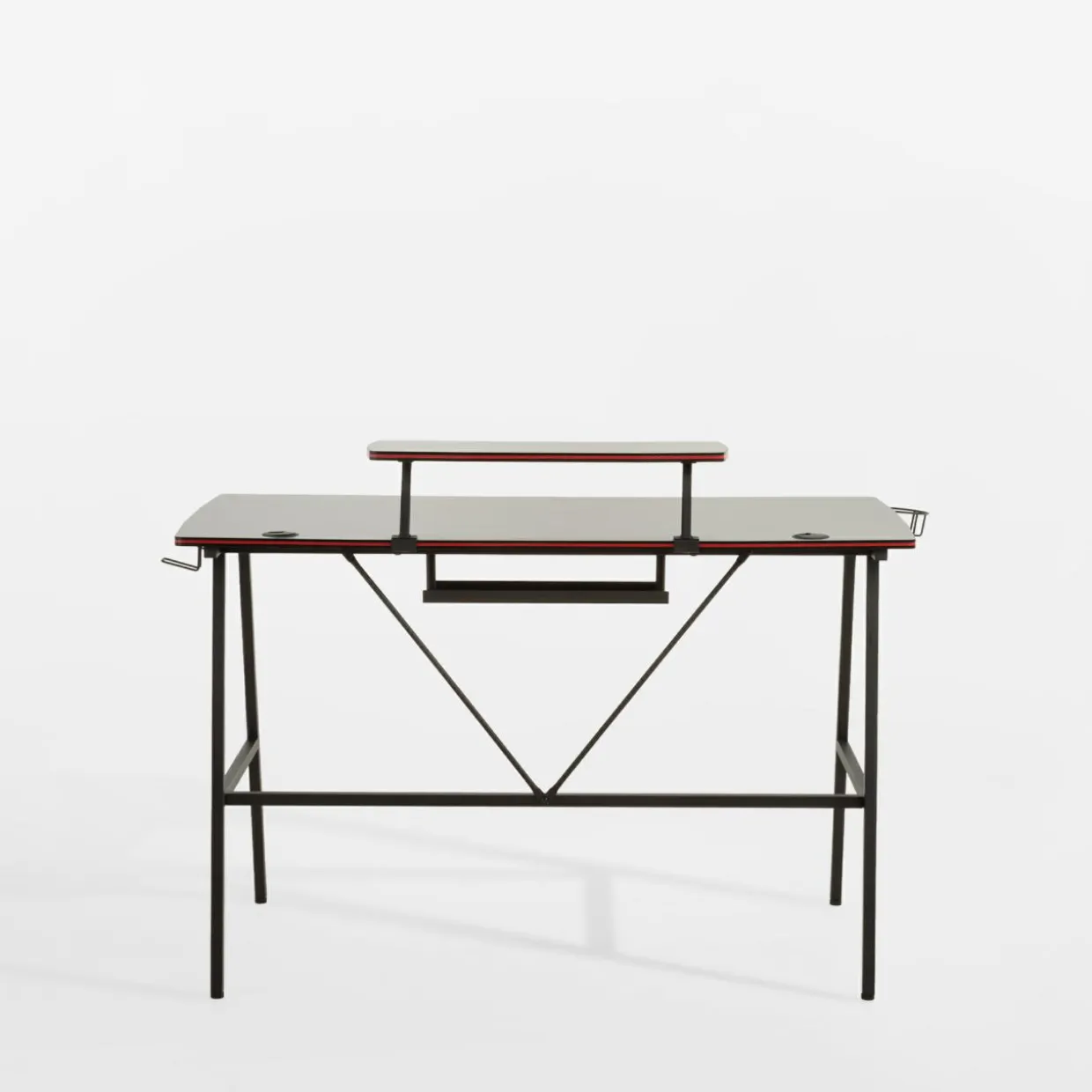 Biurko LINT zostało wykończone w czarnym kolorze z czerwonymi akcentami. Wyraźne linie na brzegu blatu i nadstawki wyglądają nowocześnie.