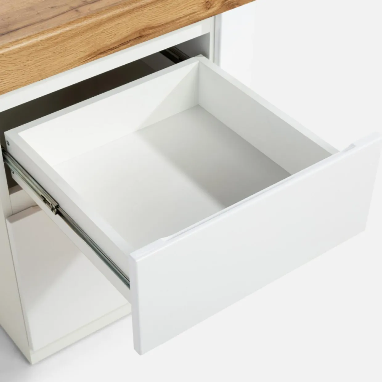 - W szufladzie pomieszczą się mniejsze przedmioty, które warto mieć pod ręką podczas nauki — długopisy, zakreślacze i pozostałe artykuły biurowe.