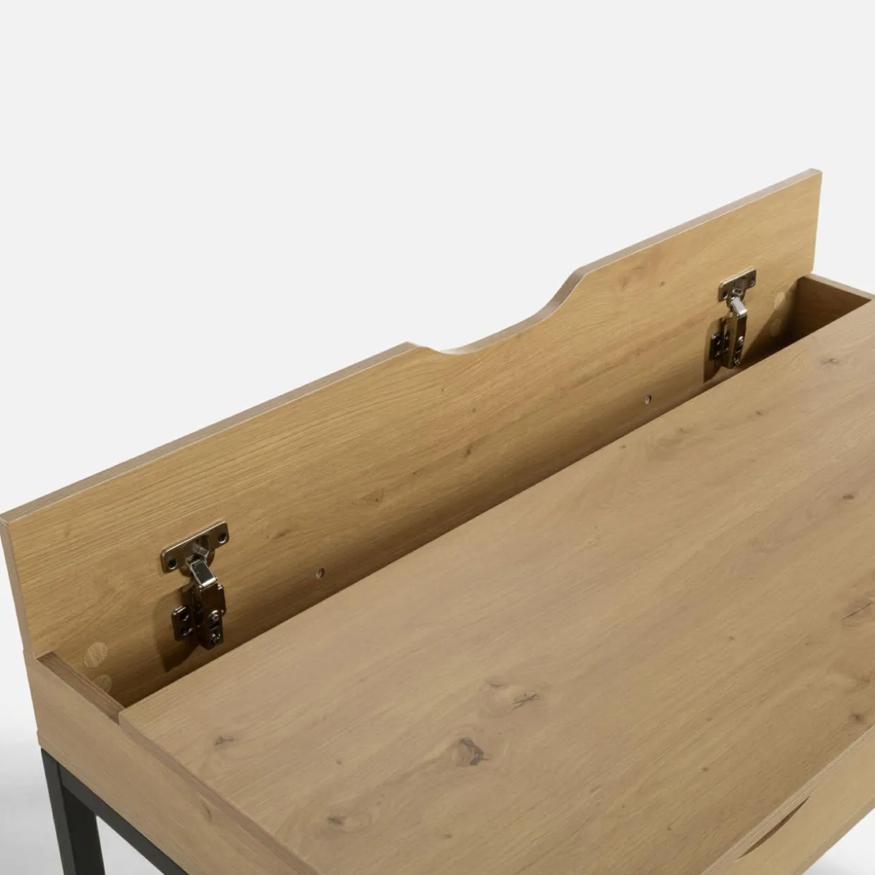 - Pudełko na kable – Wbudowany schowek z pokrywą na zawiasach pozwala na ukrycie kabli, dzięki czemu łatwo utrzymać porządek na blacie.