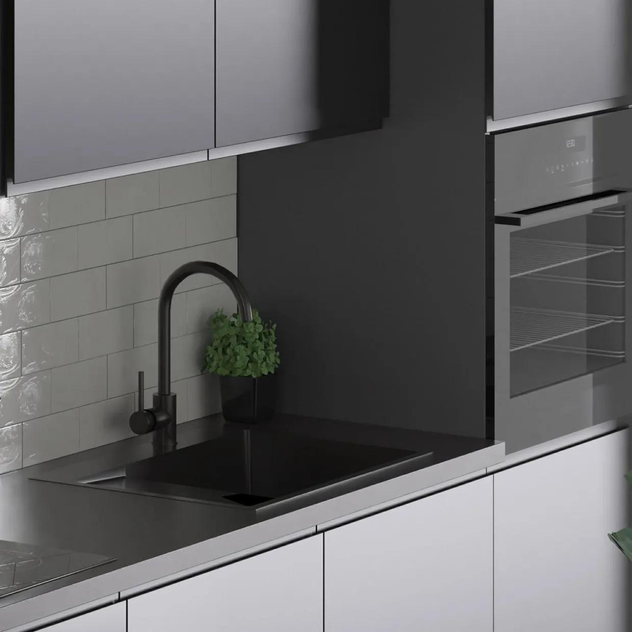 Dekor w czarnym, matowym kolorze jest przeznaczony dla kuchni urządzonych w nowoczesnym stylu. W interesujący sposób łączy ze sobą jaśniejsze i ciemniejsze elementy umeblowania pomieszczenia oraz srebrne i chromowane elementy.