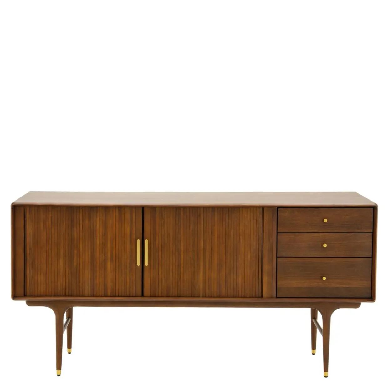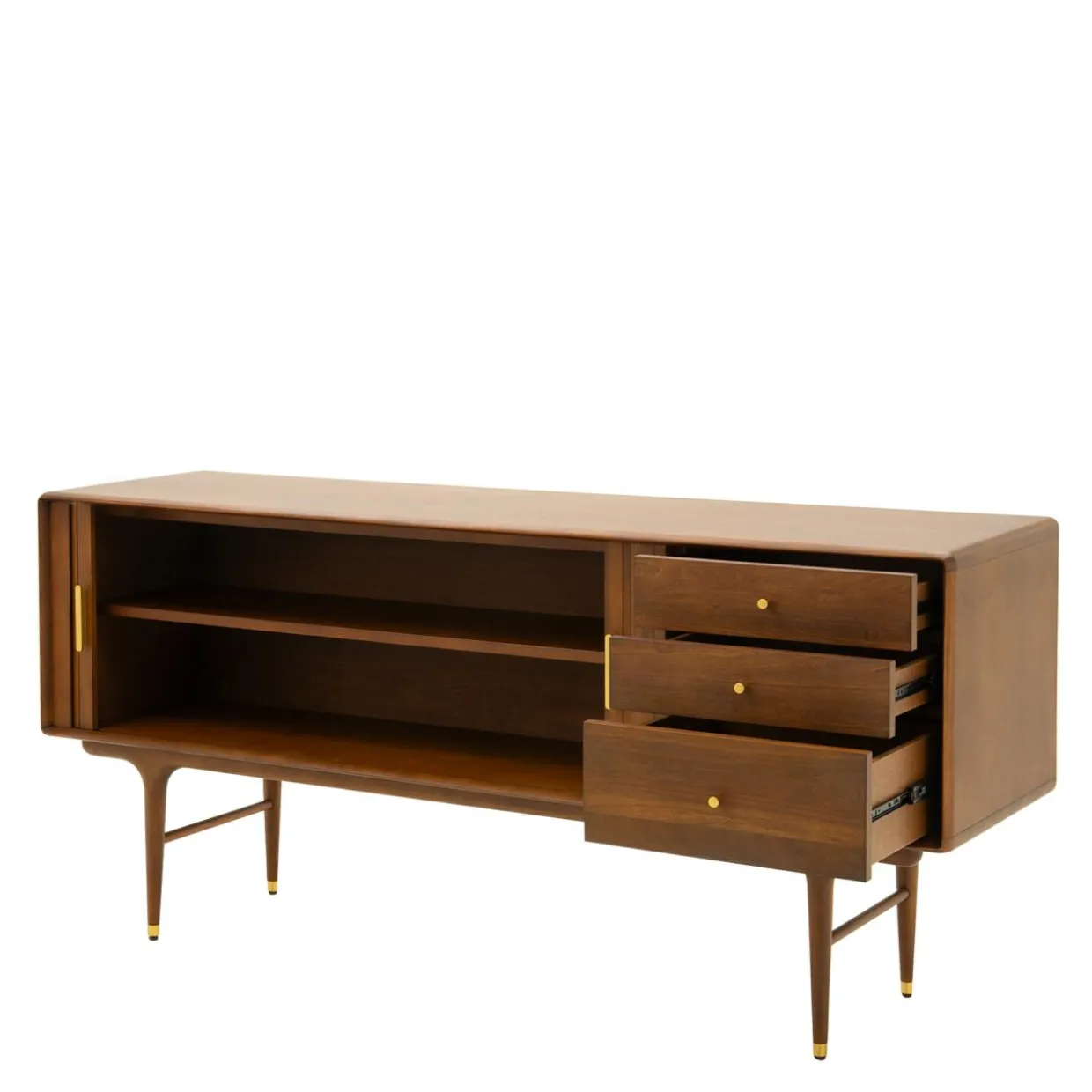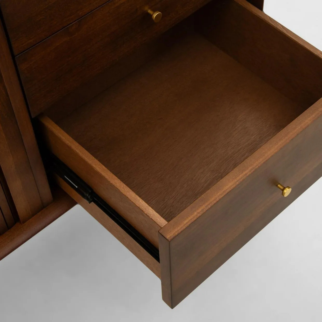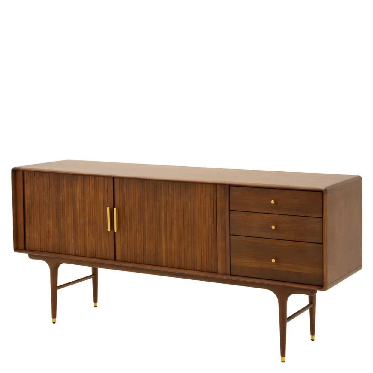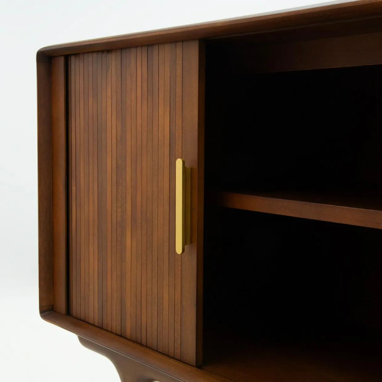 Minimalistyczne akcenty z mosiądzu w postaci uchwytów i końcówek nóżek podkreślają jakość wykonanych mebli.