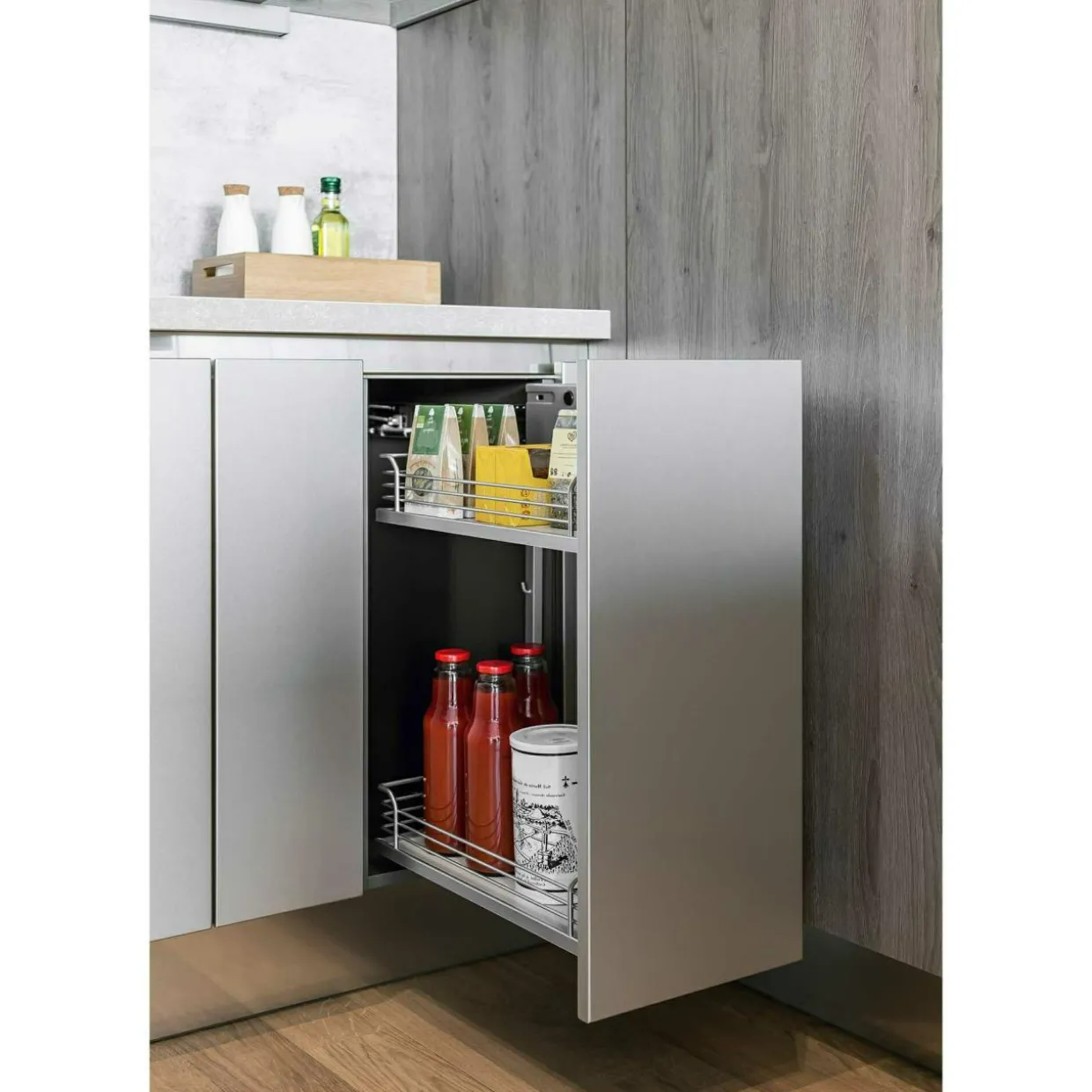 Wysuwane, pionowe szuflady, ruchome koszyki, czy półki montowane w szafkach narożnych pozwalają w intuicyjny sposób wykorzystać przestrzeń i skutecznie zarządzać nią. Wszystko jest w zasięgu wzroku i ręki bez konieczności przestawiania wielu produktów lub przetrząsania wnętrza szafki w poszukiwaniu jednej, określonej rzeczy.