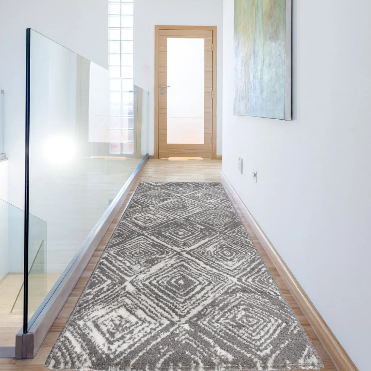 Szukasz dywanu, który nada wnętrzu nowoczesny charakter? Wybierz szary chodnik NORWAY z geometrycznym wzorem. Będzie pasował do minimalistycznego designu.