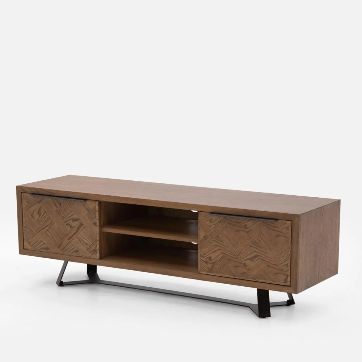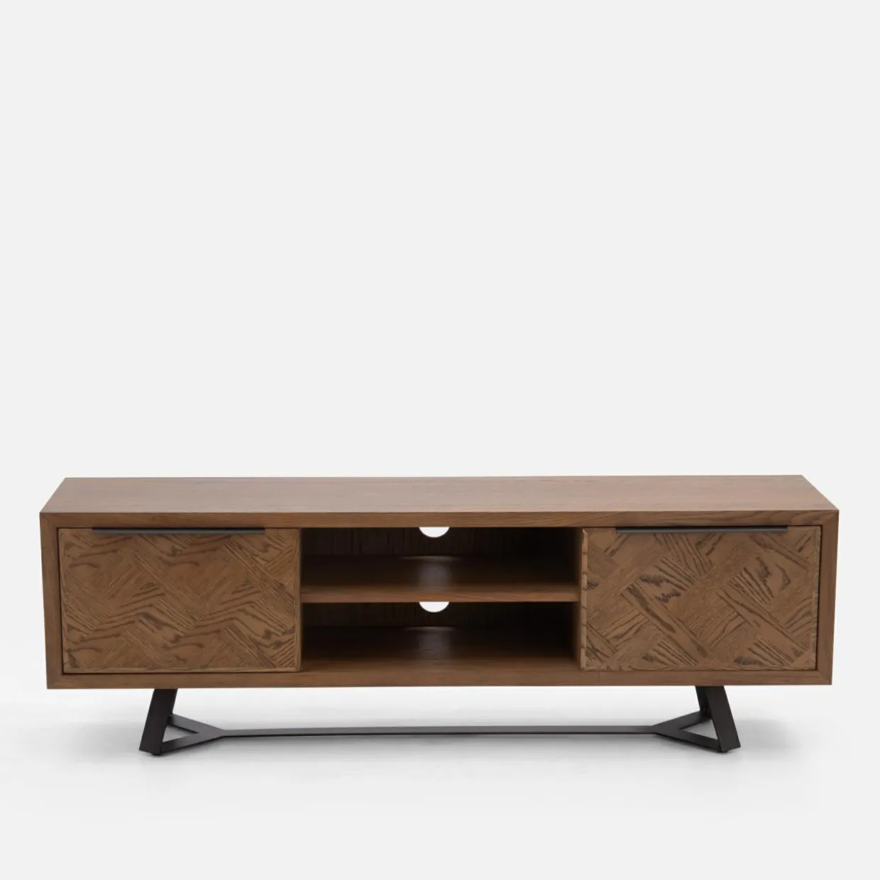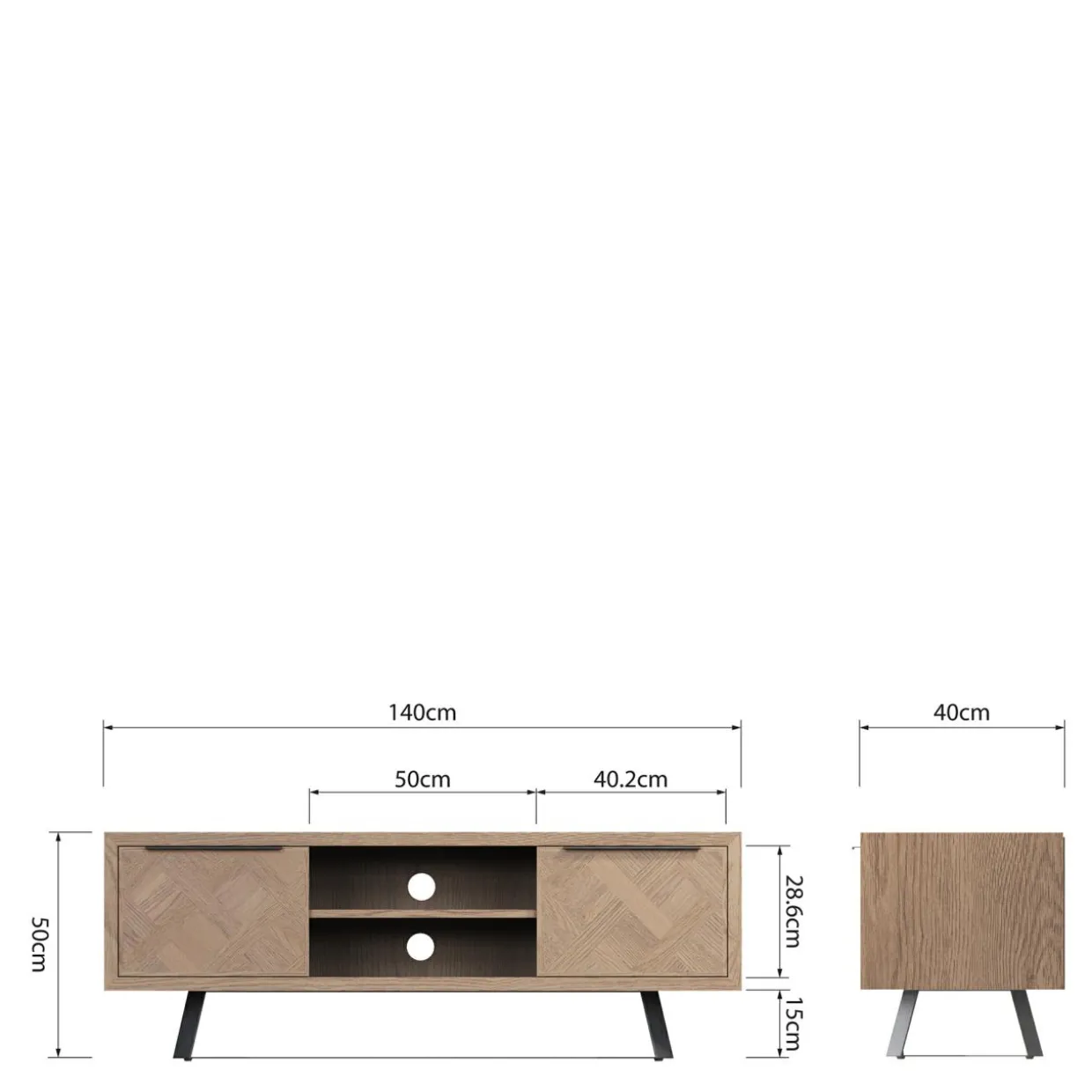 Szafka ma 40 cm głębokości – zmieści się w niewielkim salonie lub wąskim przedpokoju. Umieszczone pośrodku 2 otwarte wnęki pozwalają estetycznie wyeksponować sprzęt RTV. Do dyspozycji masz też 2 zamykane wnęki, w których możesz przechowywać dokumenty lub rzeczy, które chcesz mieć zawsze pod ręką. Zawiasy wyposażono w cichy domyk, dlatego możesz mieć pewność, że żaden hałas nie będzie rozpraszał Twoich bliskich.
