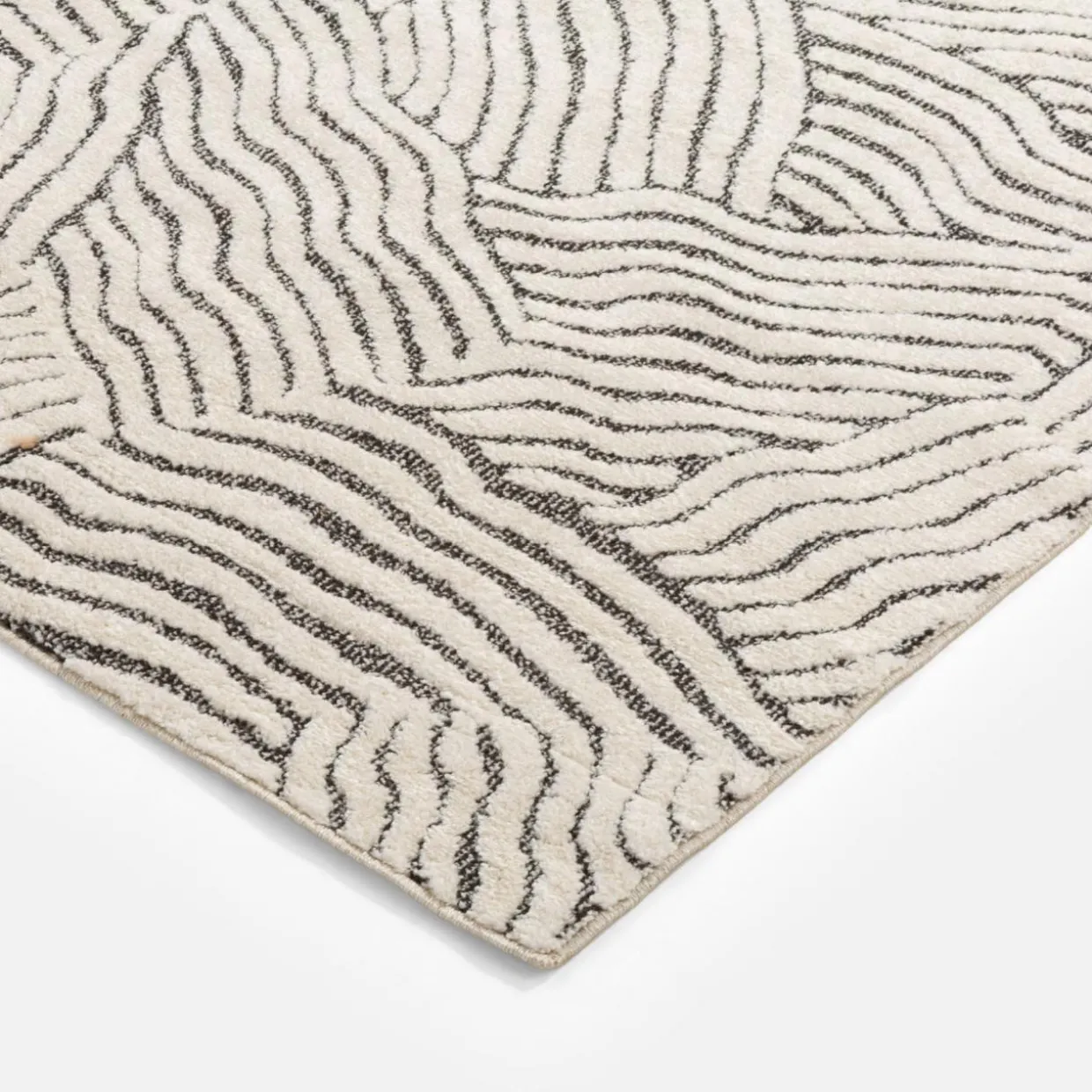 Ożyw wnętrze ciekawym abstrakcyjnym wzorem dywanu DEUS. Mozaika fal nadaje mu unikalny charakter, które przełamie monotonność gładkich podłóg. Kontrastowe połączenie kremowego i czarnego koloru wprowadzi do aranżacji ciekawy akcent.