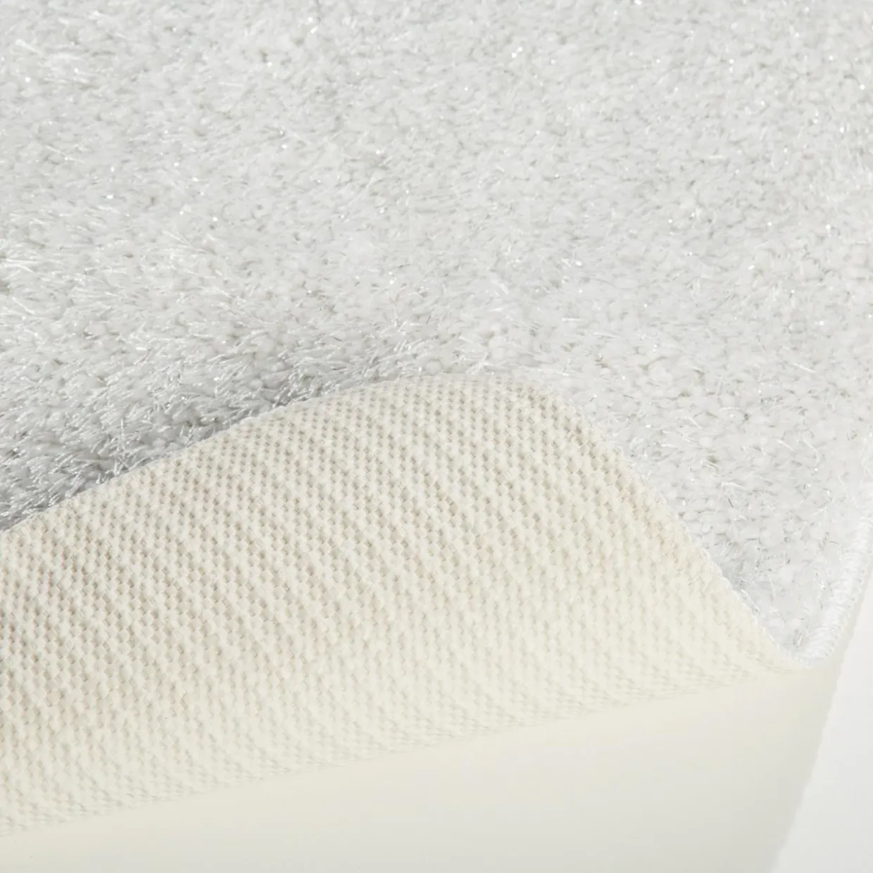 - Biały materiał przetykany jest srebrną nitką, dzięki czemu runo dywanika subtelnie połyskuje. Jeśli zależy Ci na dodatku, który wprowadzi do pomieszczenia efekt „wow”, nie zawiedziesz się, wybierając ten dywanik. Będzie pasował do nowoczesnego wnętrza okraszonego nutką glamour. Postaw na czarne lub białe płytki ścienne o wzorze marmuru i srebrne dodatki, a stworzysz aranżację spójną wizualnie.