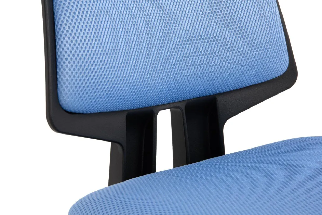 - Obicie fotela zostało wykonane z przewiewnej siatki mesh w kolorze niebieskim.
