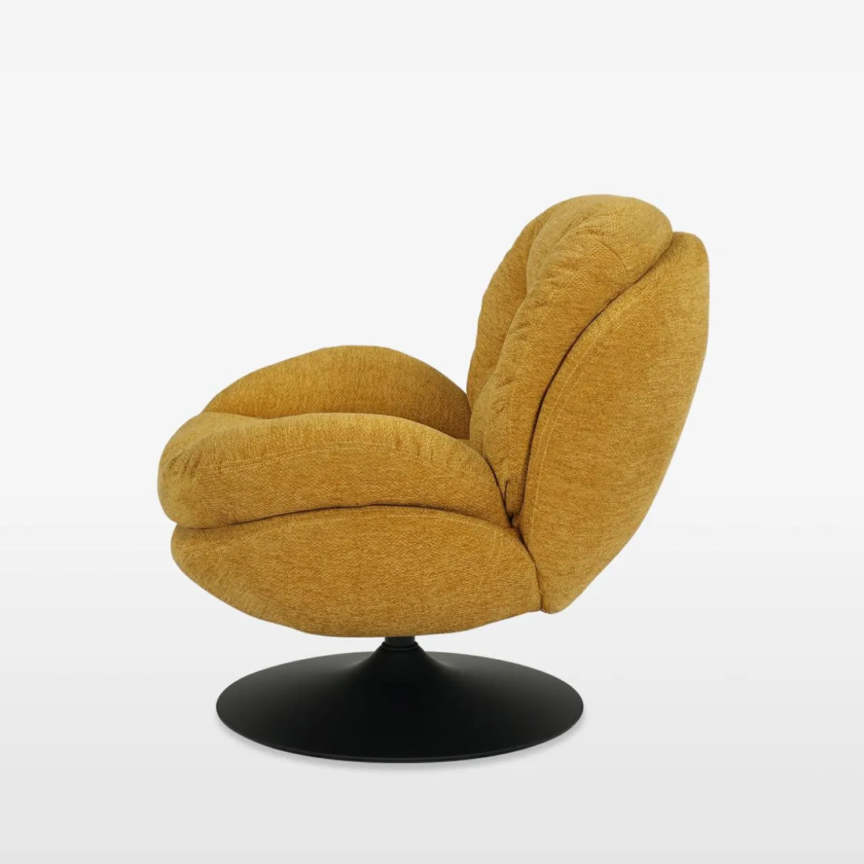 Fotel DUNNE będzie kolorowym akcentem w Twoim wnętrzu. Musztardowy odcień połączysz z butelkową zielenią, granatem i ciemnym drewnem – stworzysz stylową przestrzeń retro.