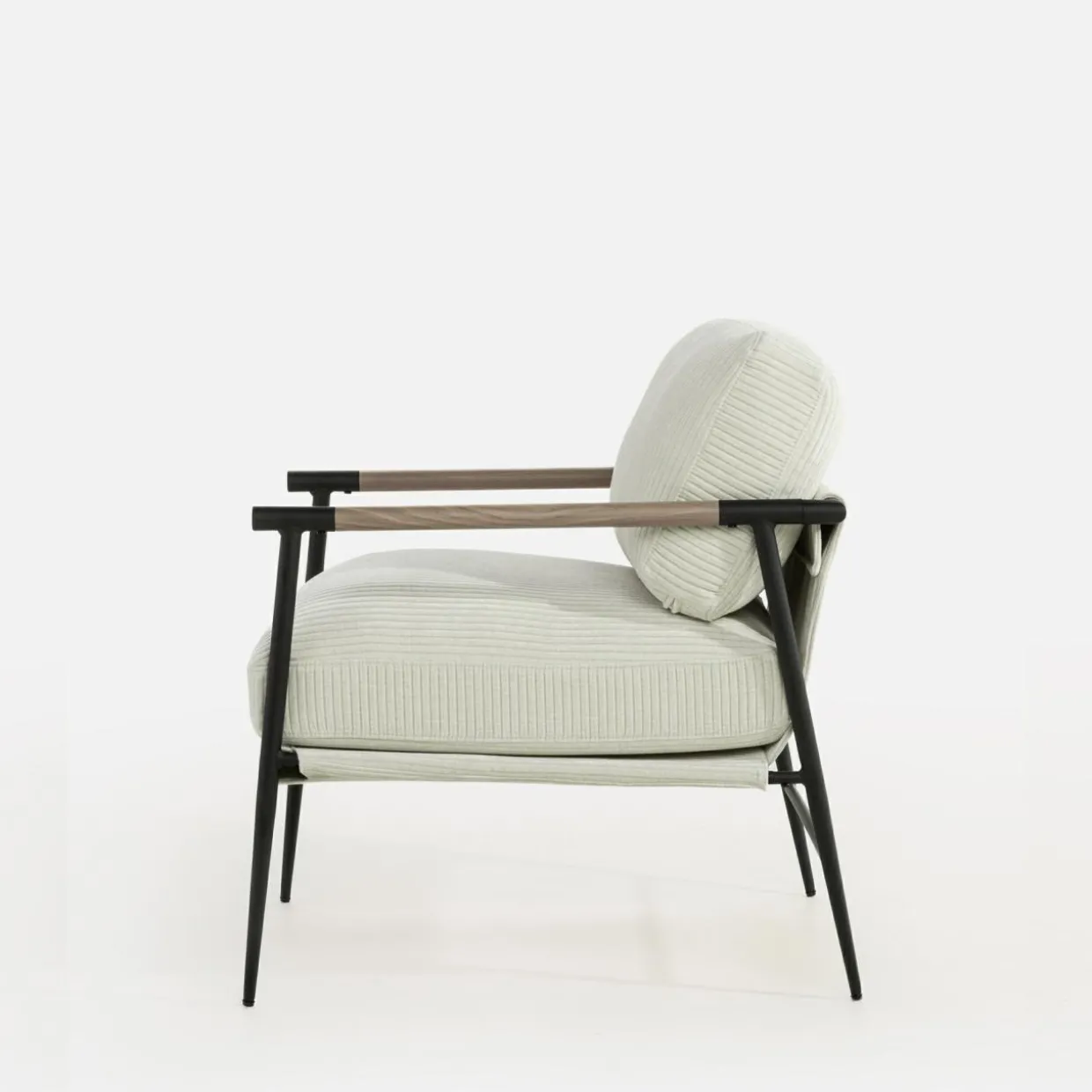 - Metalowa rama z wzorem imitującym drewno nadaje fotelowi lekkości.