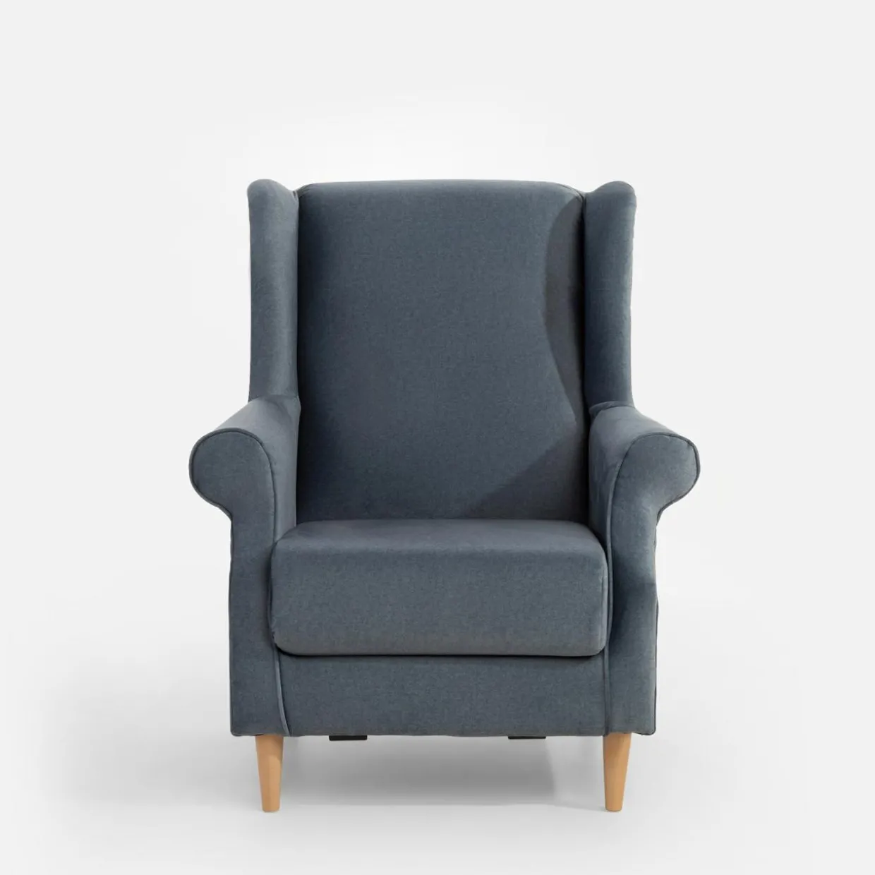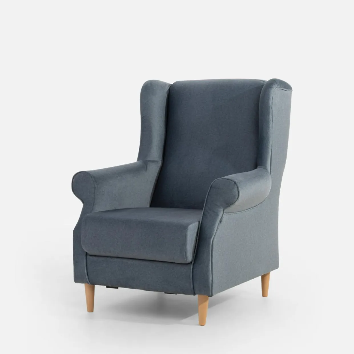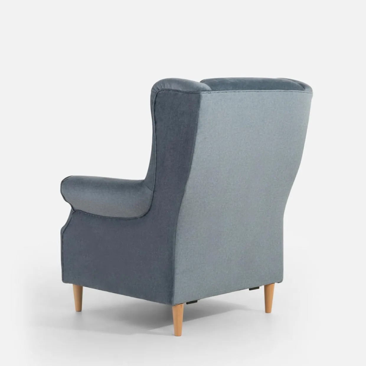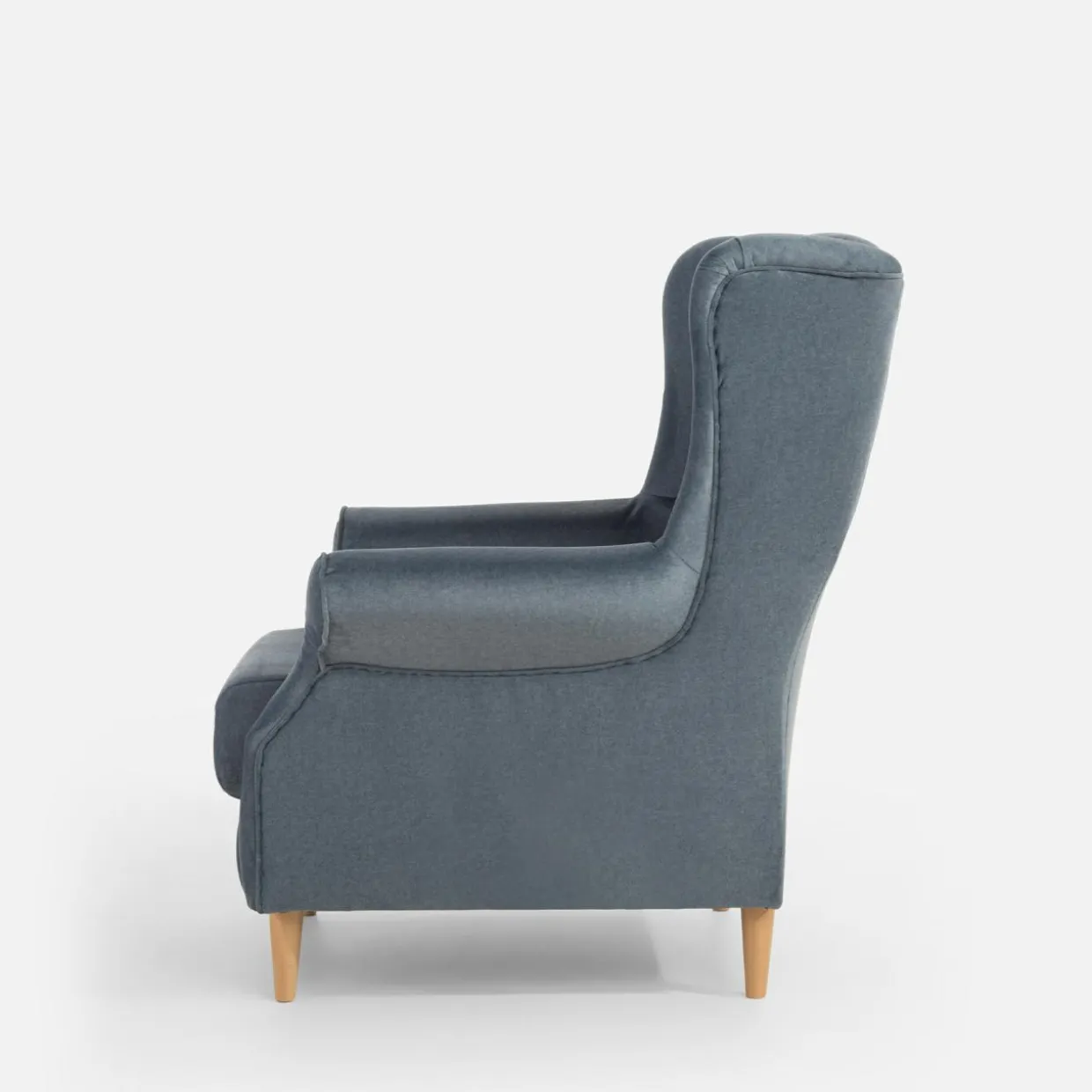 Fotel SERENA ma klasyczny kształt uszaka – urządzisz z nim przytulny kącik w salonie. Połączenie niebieskiego weluru i drewnianych nóżek będzie pasować do salonu urządzonego w stylu skandynawskim lub retro.