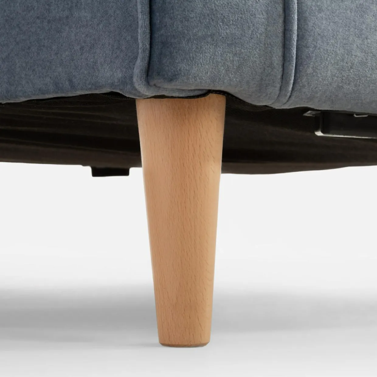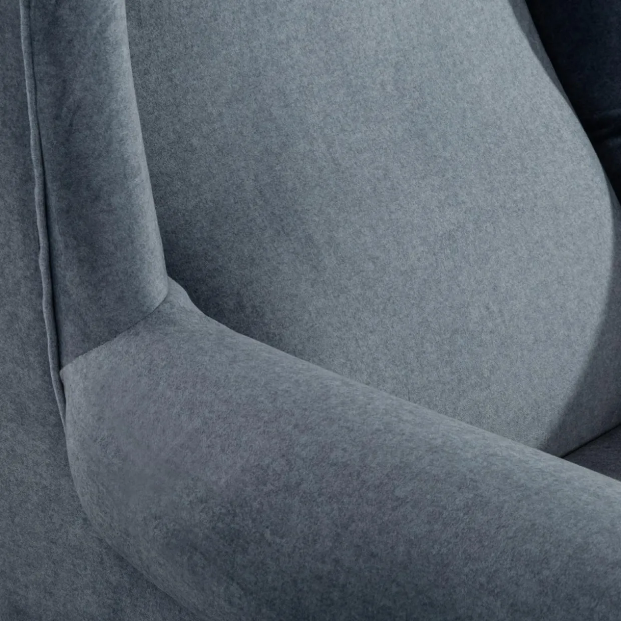 - Welur w niebieskim kolorze i drewniane nóżki nadają fotelowi lekkości, dzięki czemu nie przytłoczy wnętrza.