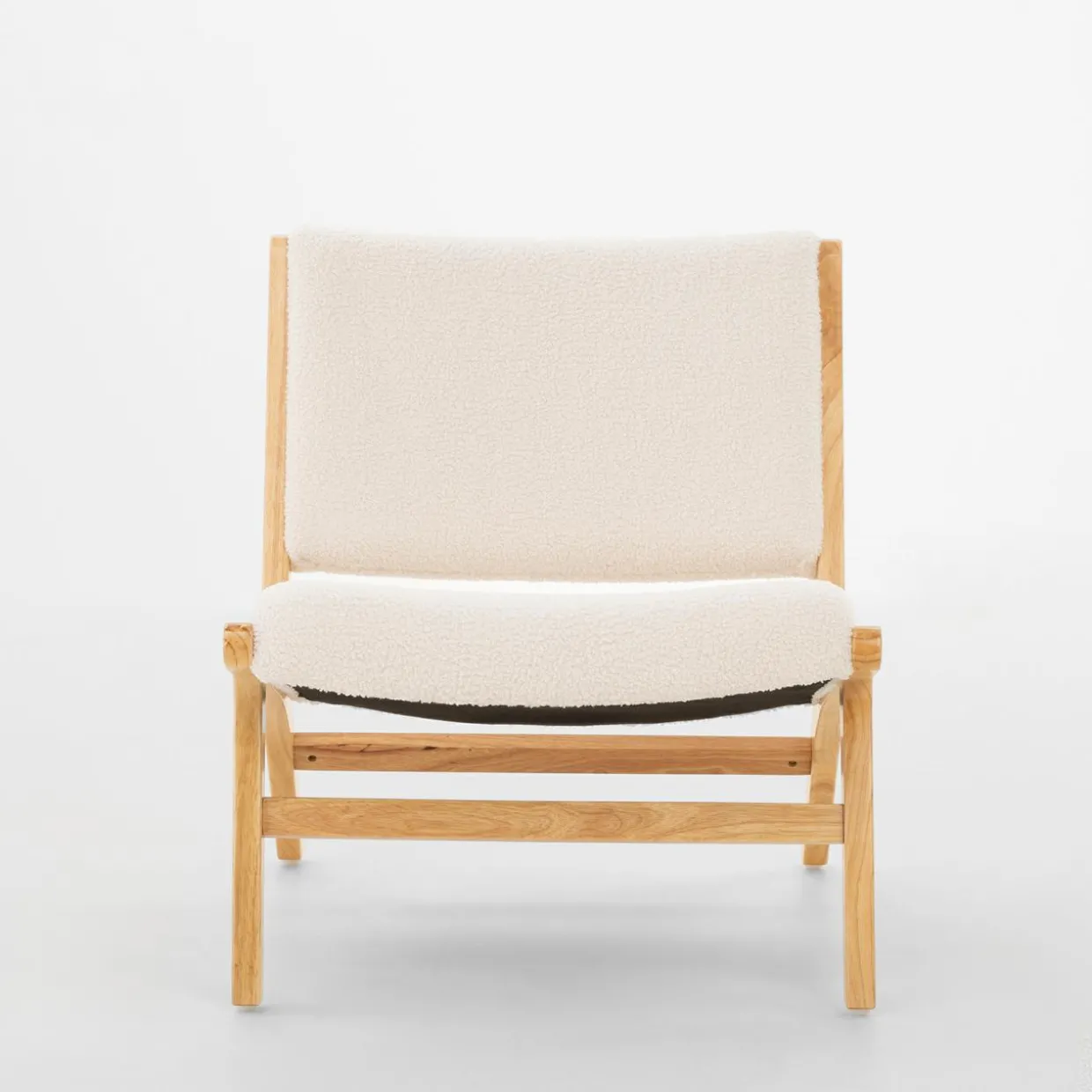 - Połączenie jasnego drewna i beżowej tkaniny boucle będzie pasować zarówno do skandynawskiego wnętrza, jak i tego urządzonego w stylu nowoczesnym.