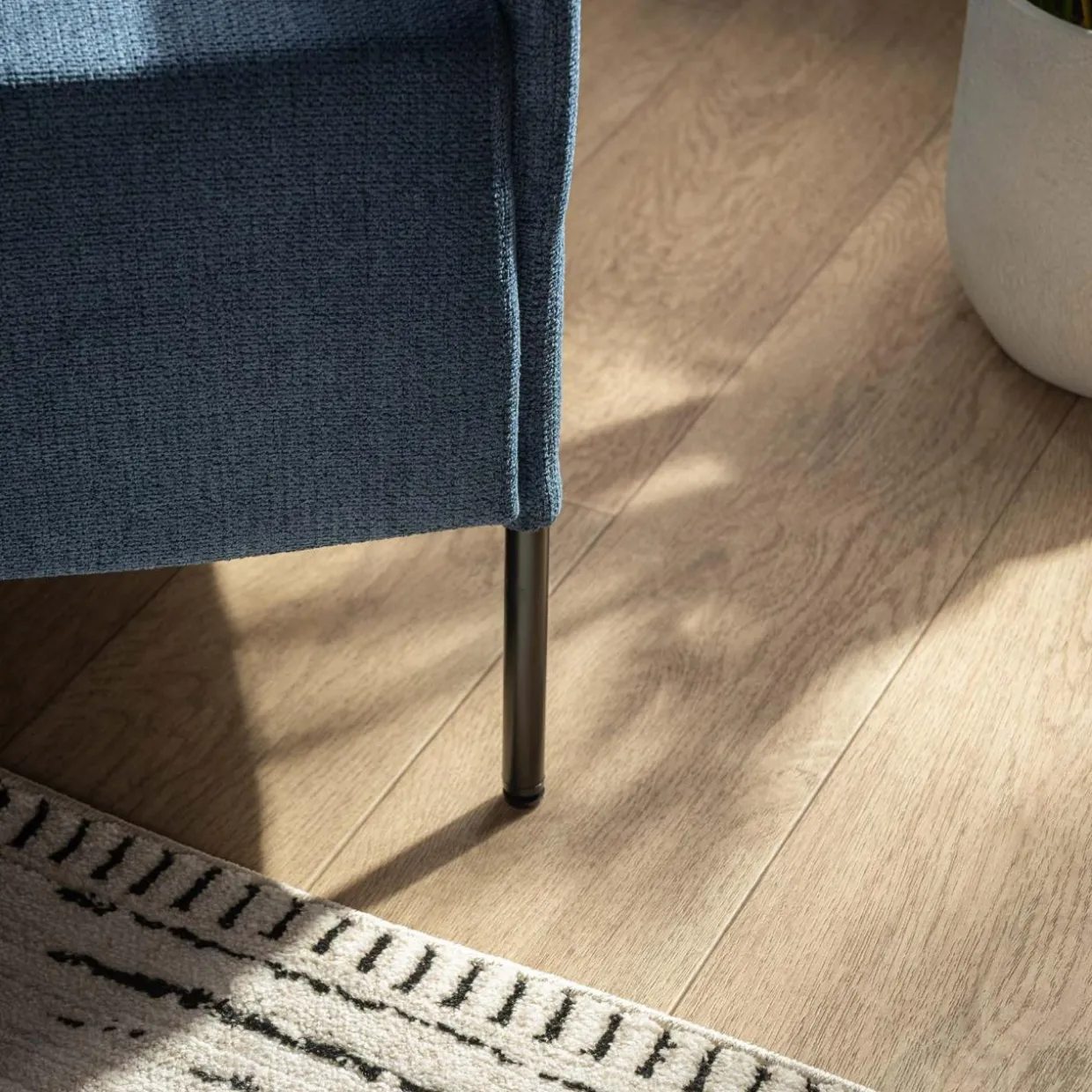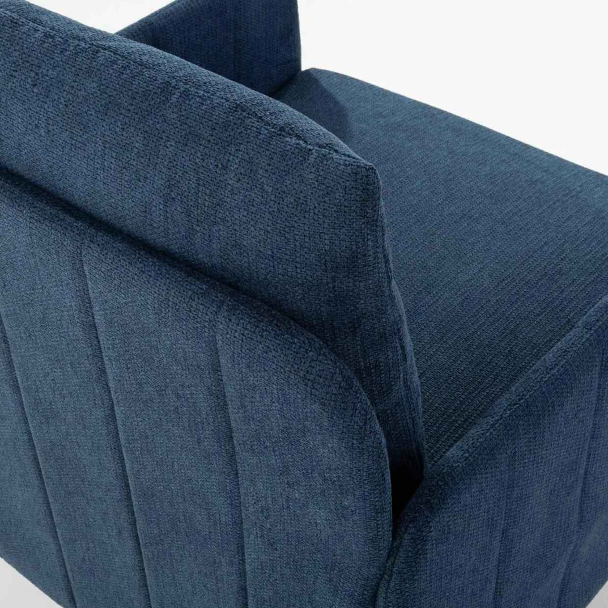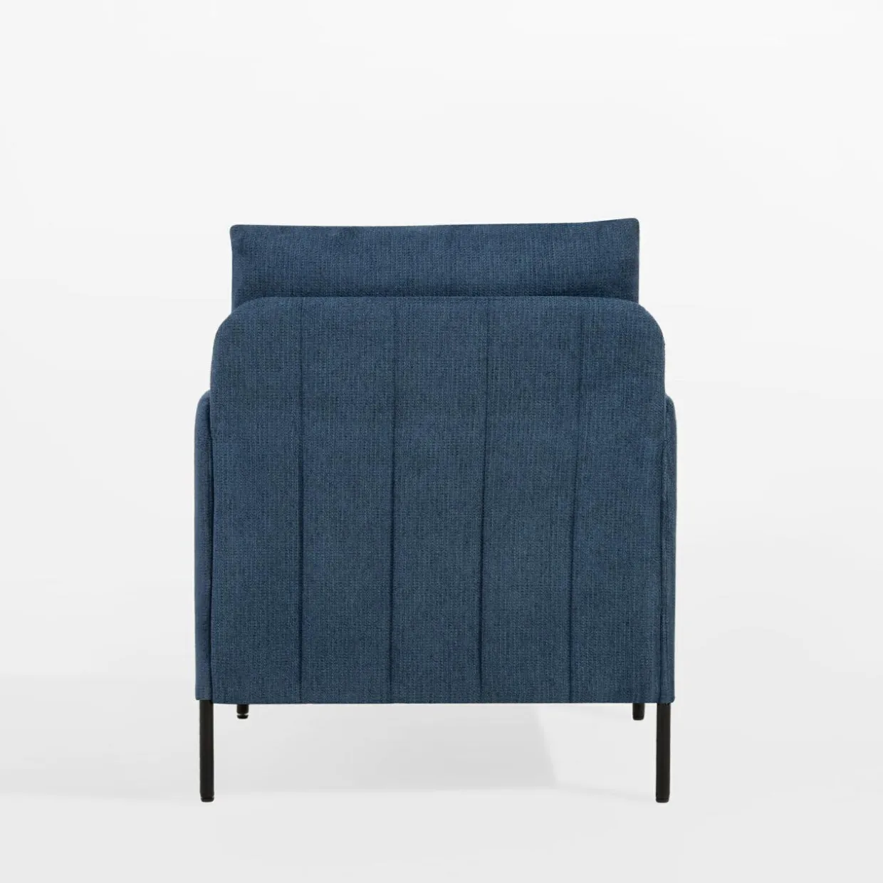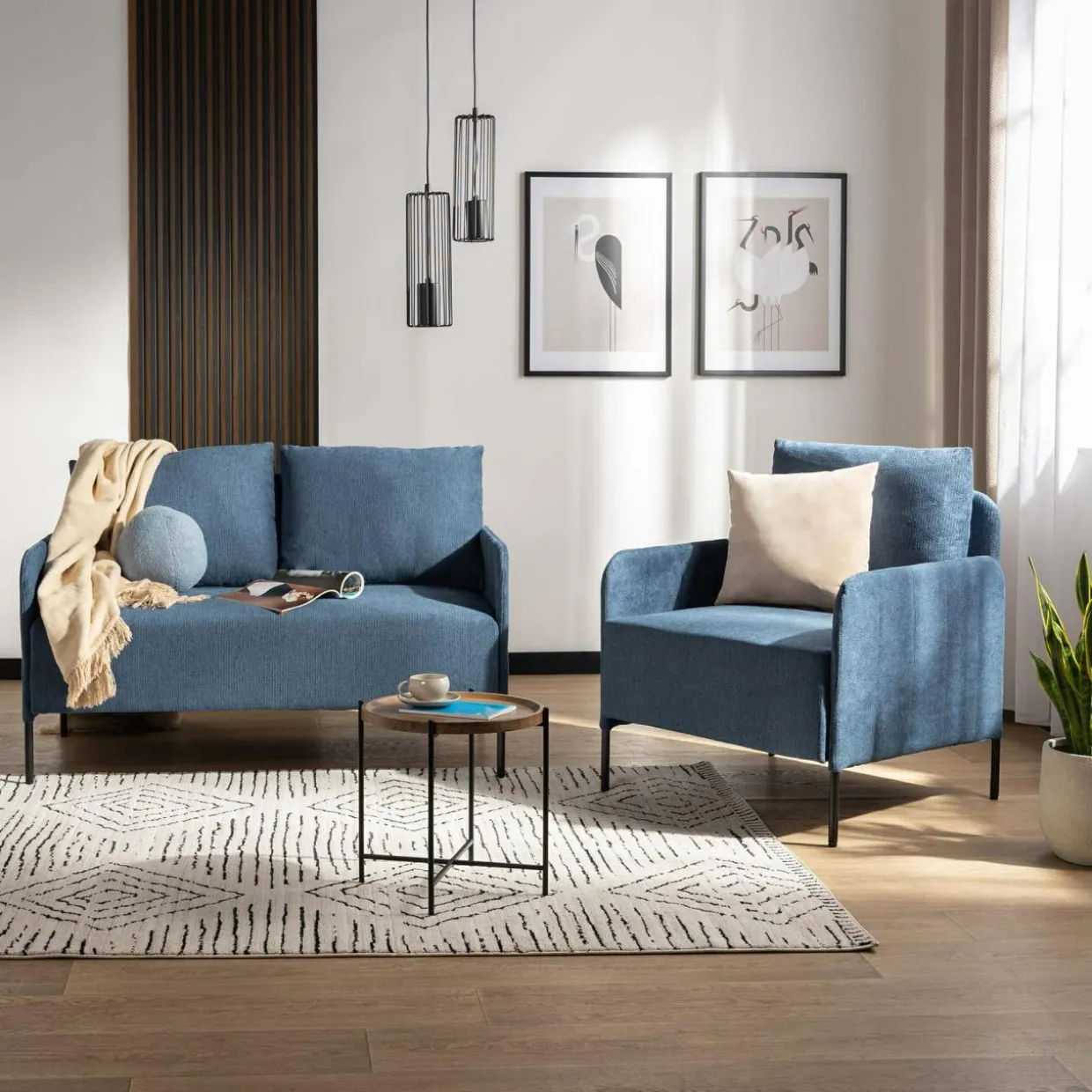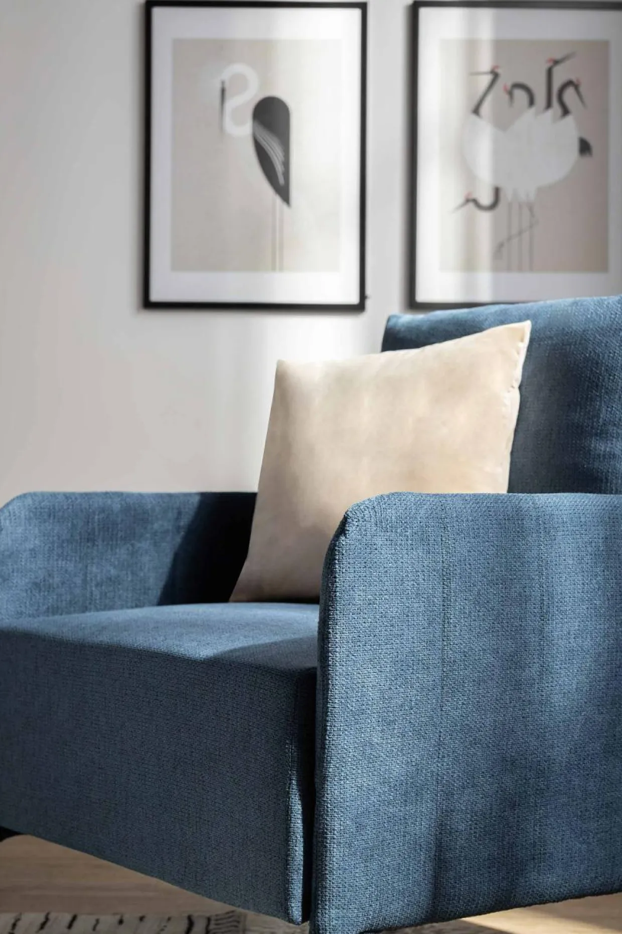 - Niebieski odcień – dodaj poduszkę w kolorze jasnoszarym lub musztardowym, a całość ustaw na tle jasnej ściany. Dopełnij aranżację stolikiem bocznym z metalowymi akcentami i stylową lampą podłogową, tworząc elegancki kącik wypoczynkowy.