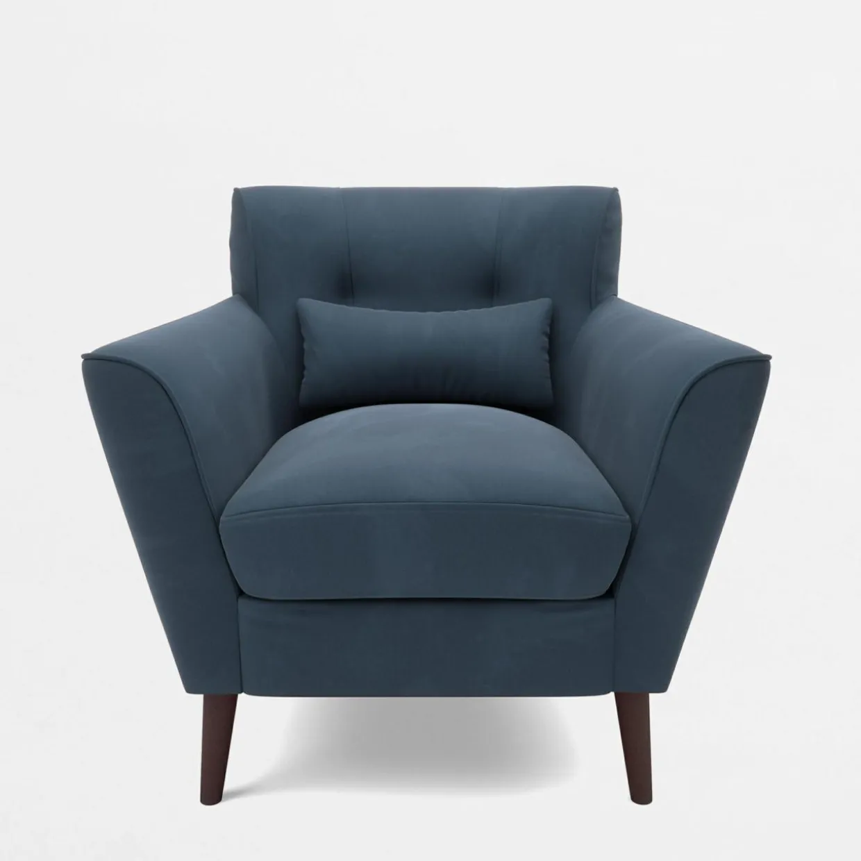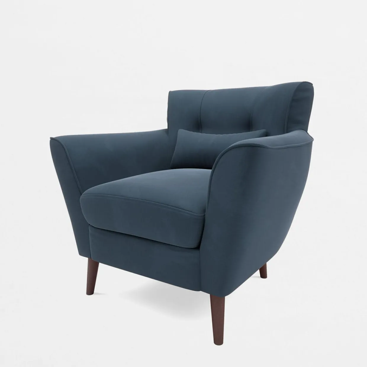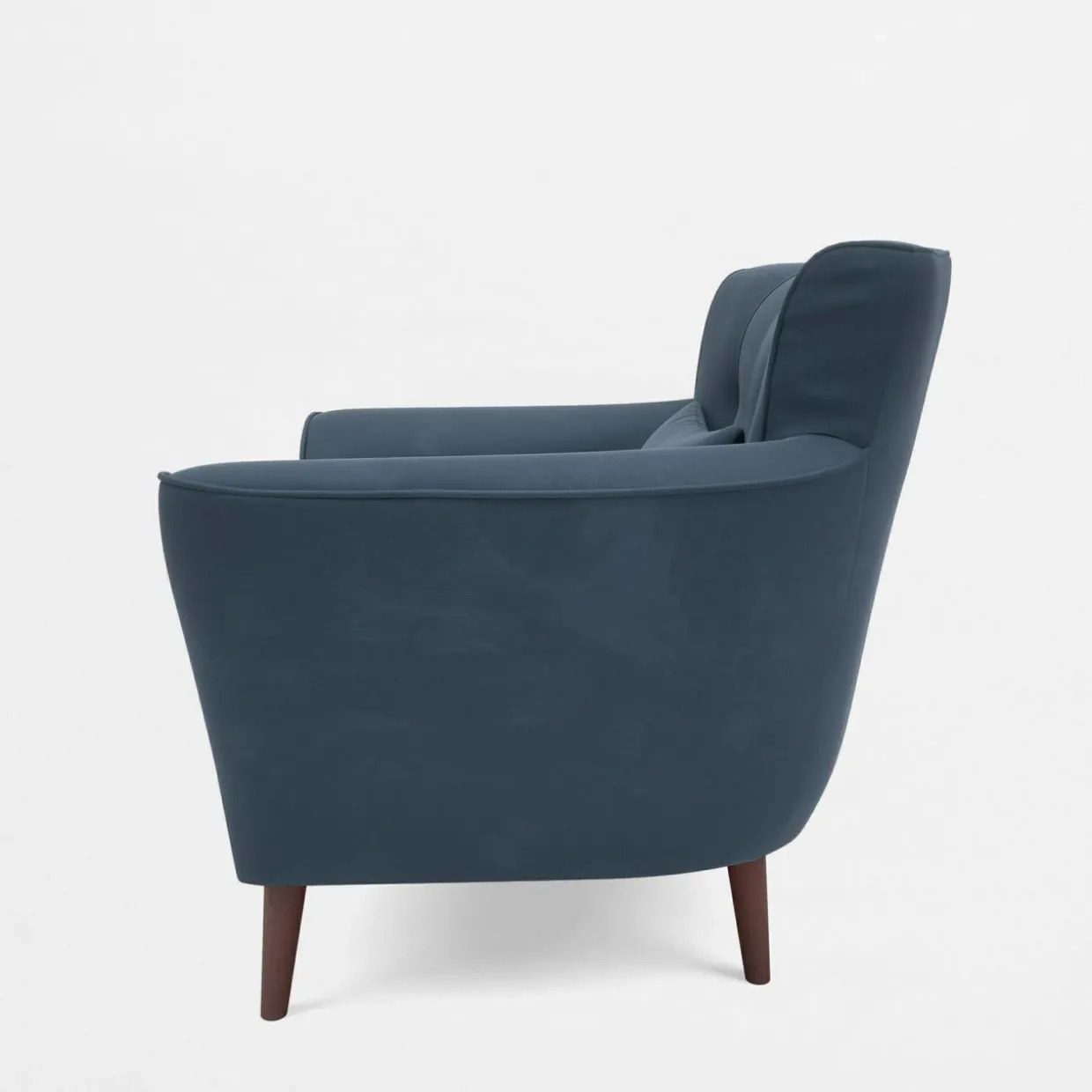 - Wysokie nóżki z ciemnego drewna podnoszą fotel, nadając mu lekkości.