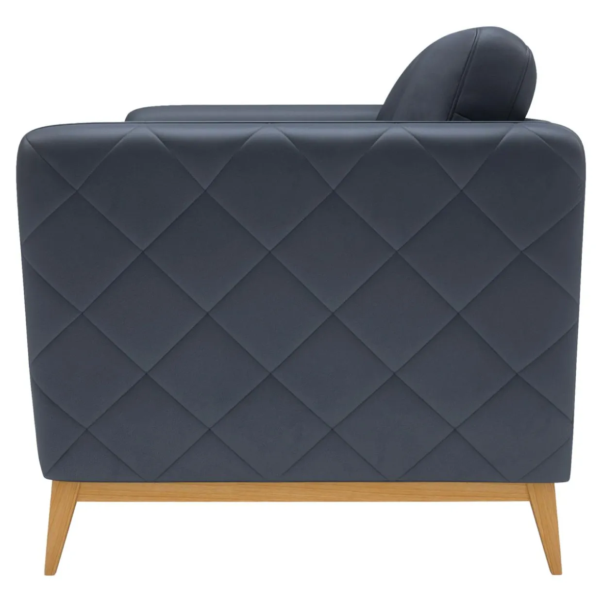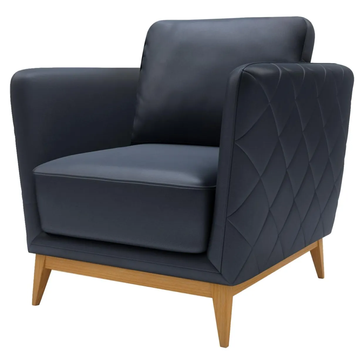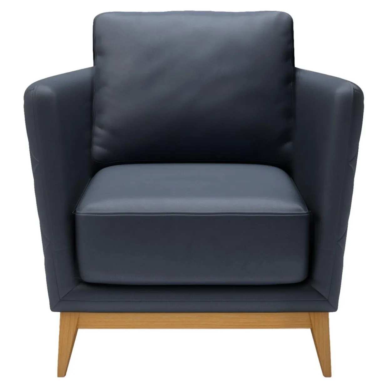 Fotel pokryto skórą naturalną HERMES OCEAN BLUE. Drewniana podstawa, zakończona lekko ukośnymi nóżkami dodaje meblowi lekkości.