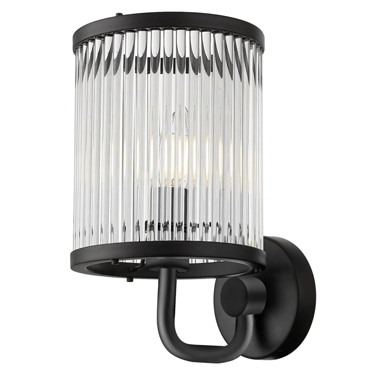 - Szklany klosz kinkietu podkreślony metalowymi obręczami i podstawą z czarnym wykończeniem wspaniale komponuje się z chłodnymi, jasnymi kolorami wnętrza.