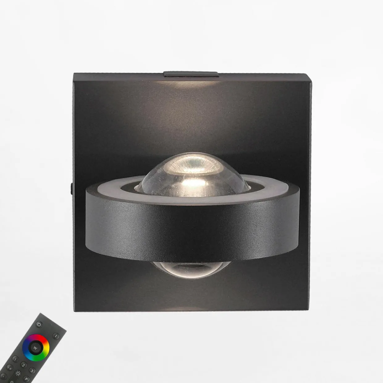 - Q-MIA to kinkiet sterowny pilotem i aplikacją – posiada regulację jasności, możliwość włączenia koloru oraz programy (gotowe scenerie oświetlenia).