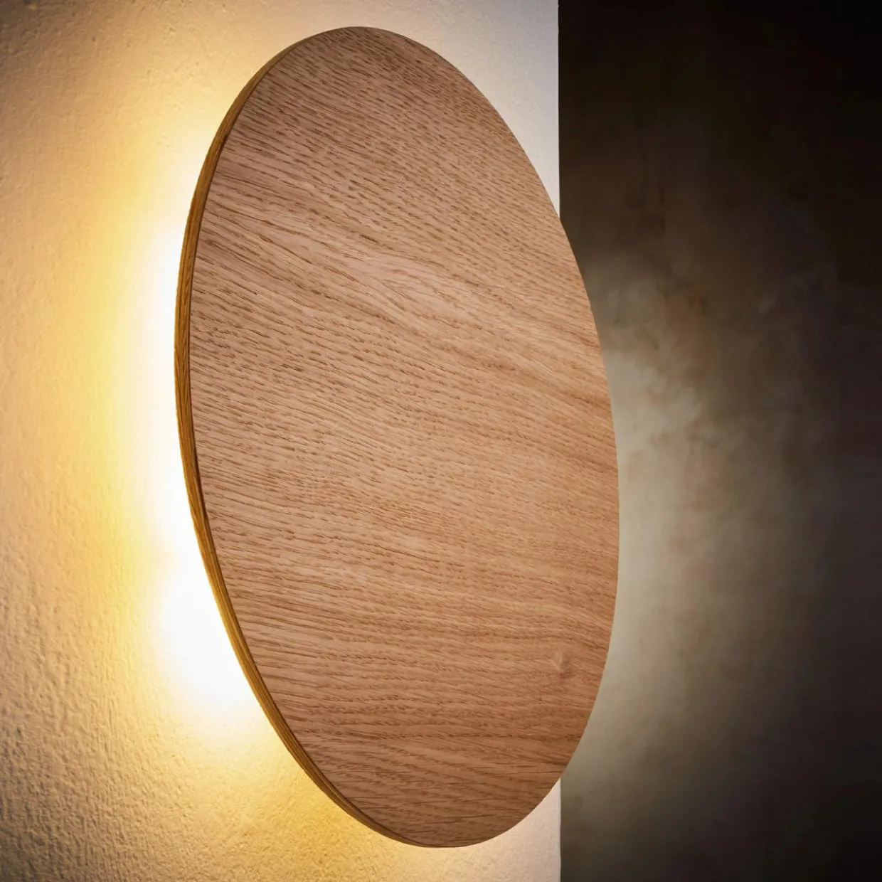 Wersja kinkietu LUNA z wykończeniem w kolorystyce jasnego drewna oświetla przestrzeń w osobliwy sposób.