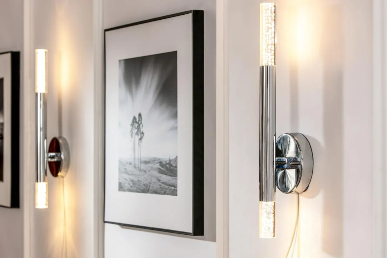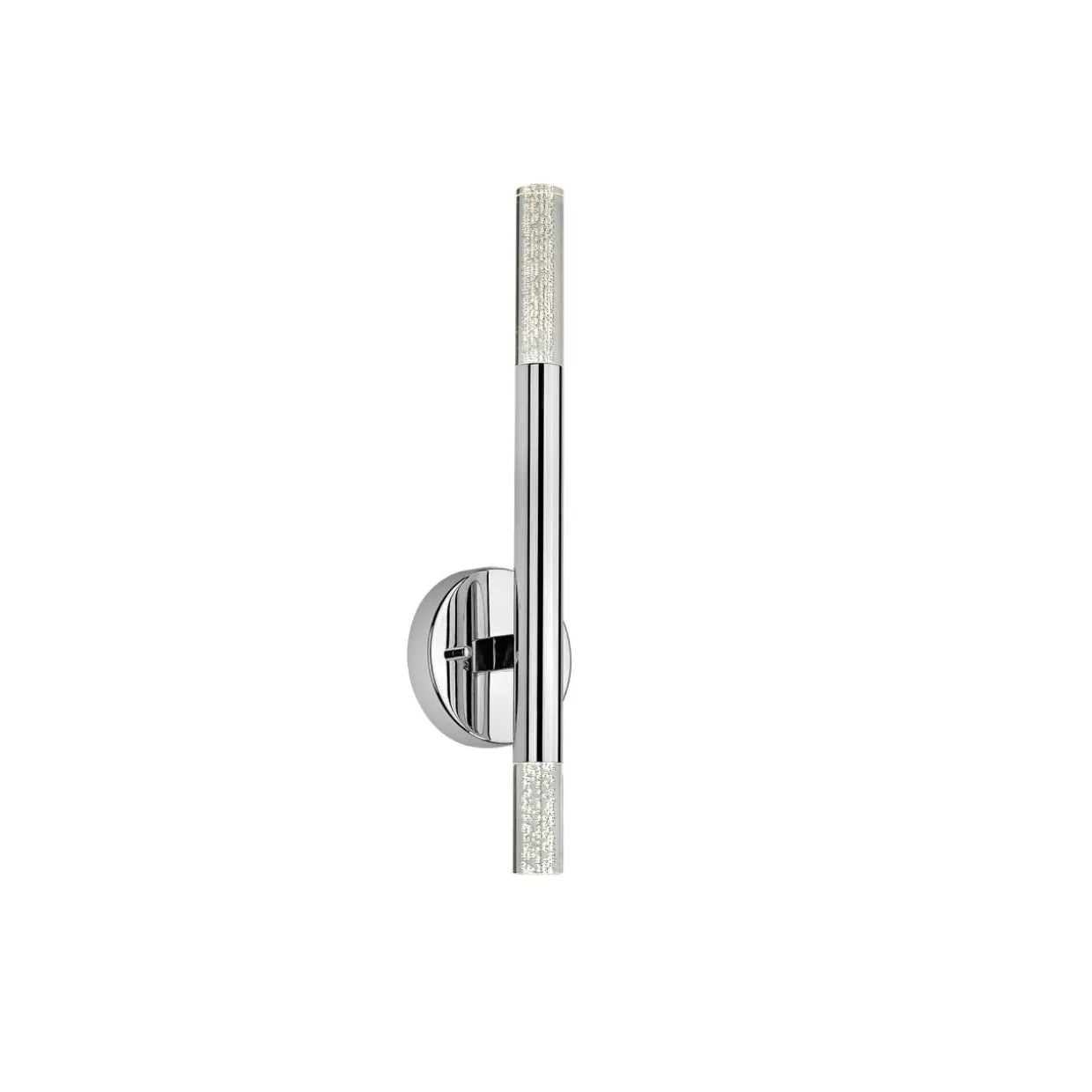 Obudowa w kształcie pionowo zawieszonej tulei została wykonana z metalu i wzbogacona o akrylowe elementy. Całość wykończona chromem optycznie rozjaśnia pomieszczenie i współgra zarówno z jasną, jak i ciemną kolorystyką ścian, mebli oraz dodatków dekoracyjnych.