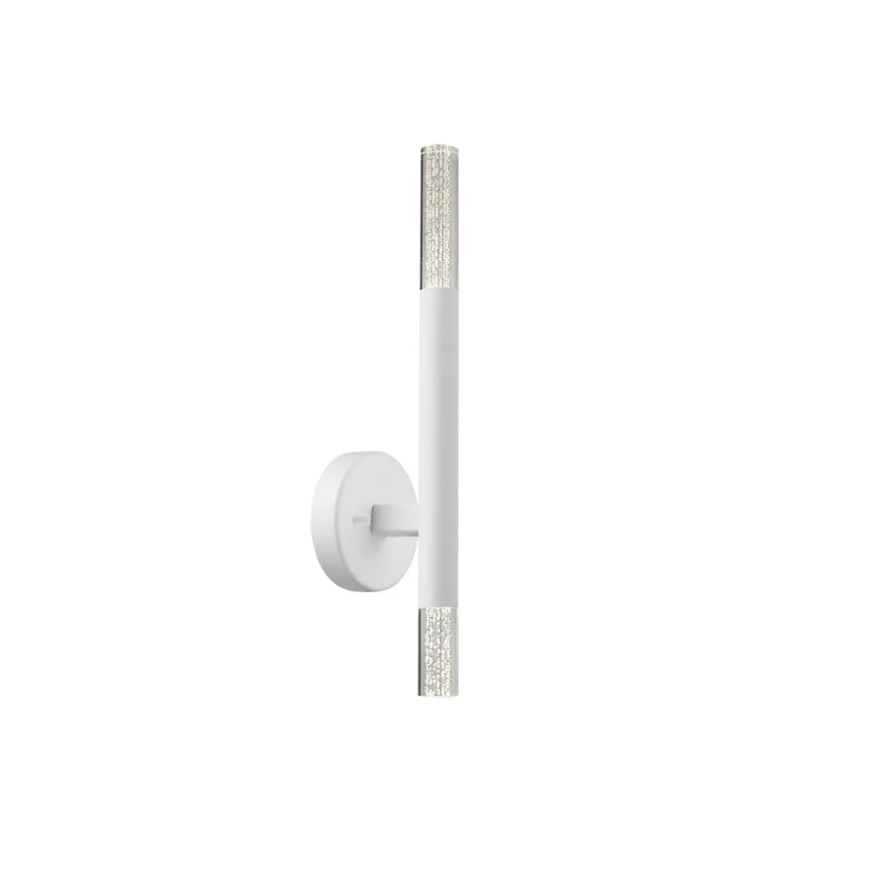 Obudowa w kształcie pionowo zawieszonej tulei została wykonana z metalu i wzbogacona o akrylowe elementy. Całość wykończona białym kolorem optycznie rozjaśnia pomieszczenie i współgra z jasną kolorystyką ścian, mebli oraz dodatków dekoracyjnych.
