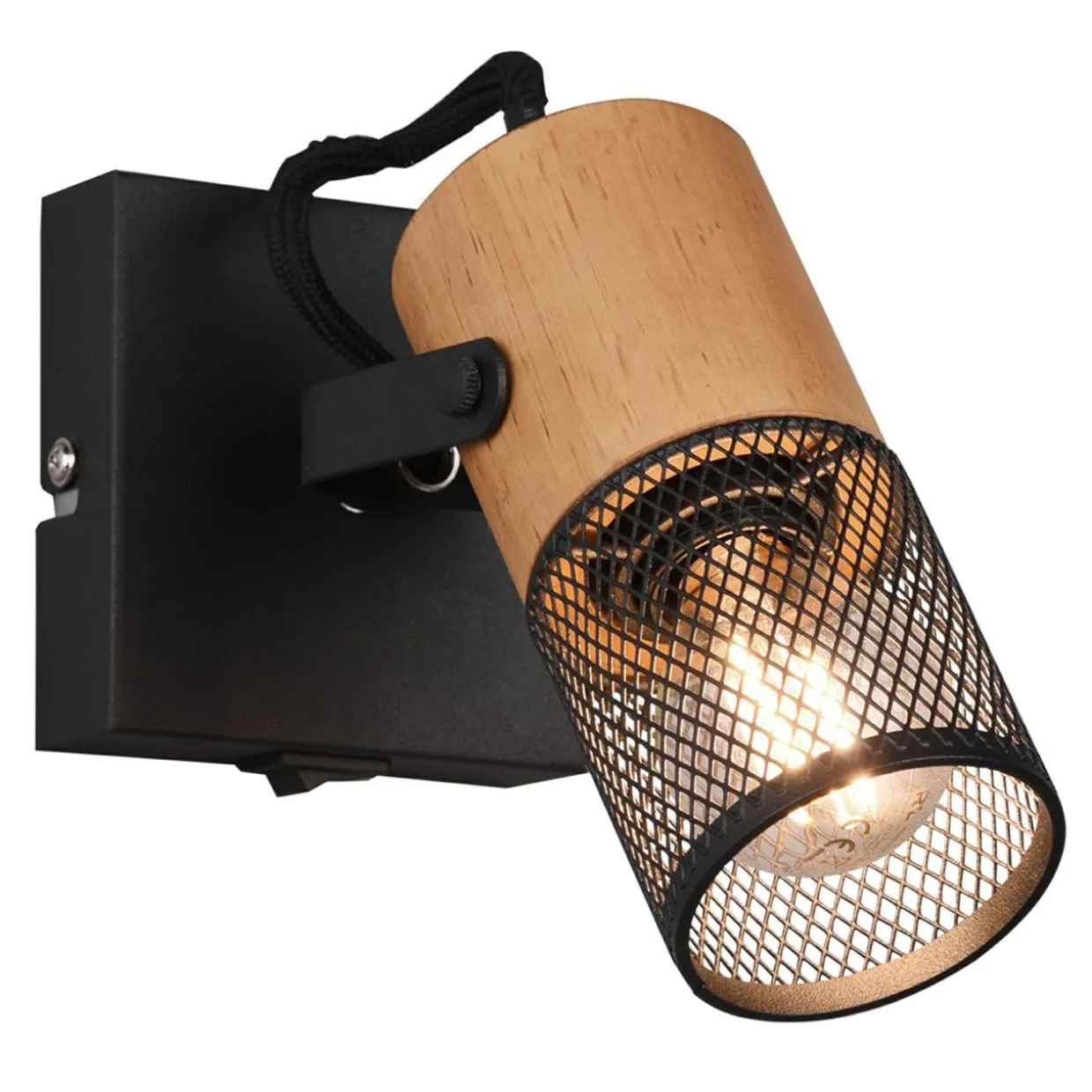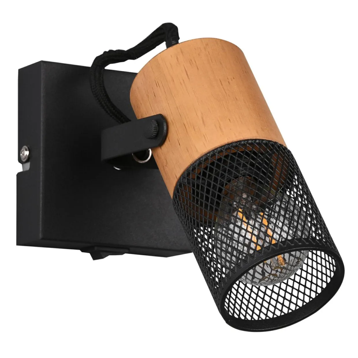 Czarna, podstawa na bazie kwadratu łączy się z kloszem, którego tylna część jest drewniana, a przednia wykonana z metalowej siateczki. Wewnątrz znajduje się miejsce dla pojedynczej żarówki typu E14.