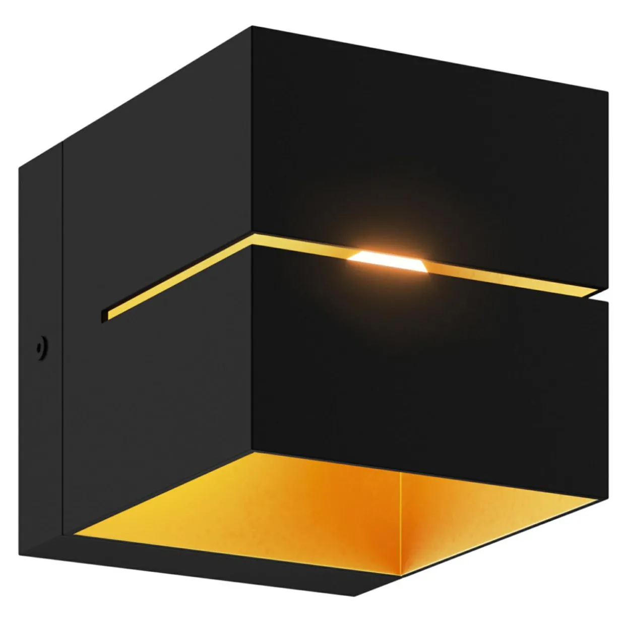 - Czarny kolor obudowy ze złotym wykończeniem środka sprawia, że kinkiet dobrze wygląda w połączeniu z aranżacjami, które opierają się na ciepłej tonacji kolorystycznej.