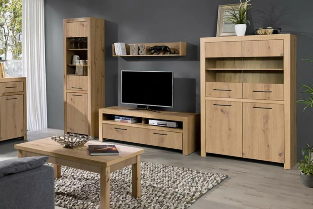 - Mebel pokryto laminatem w kolorze jasnego dębu artisan.