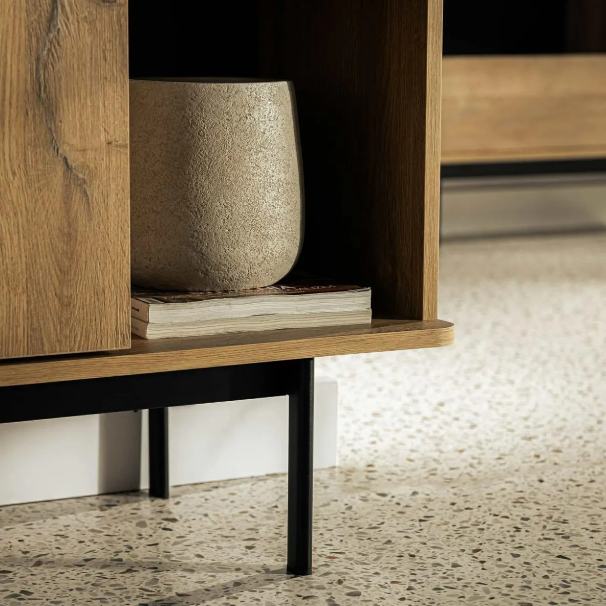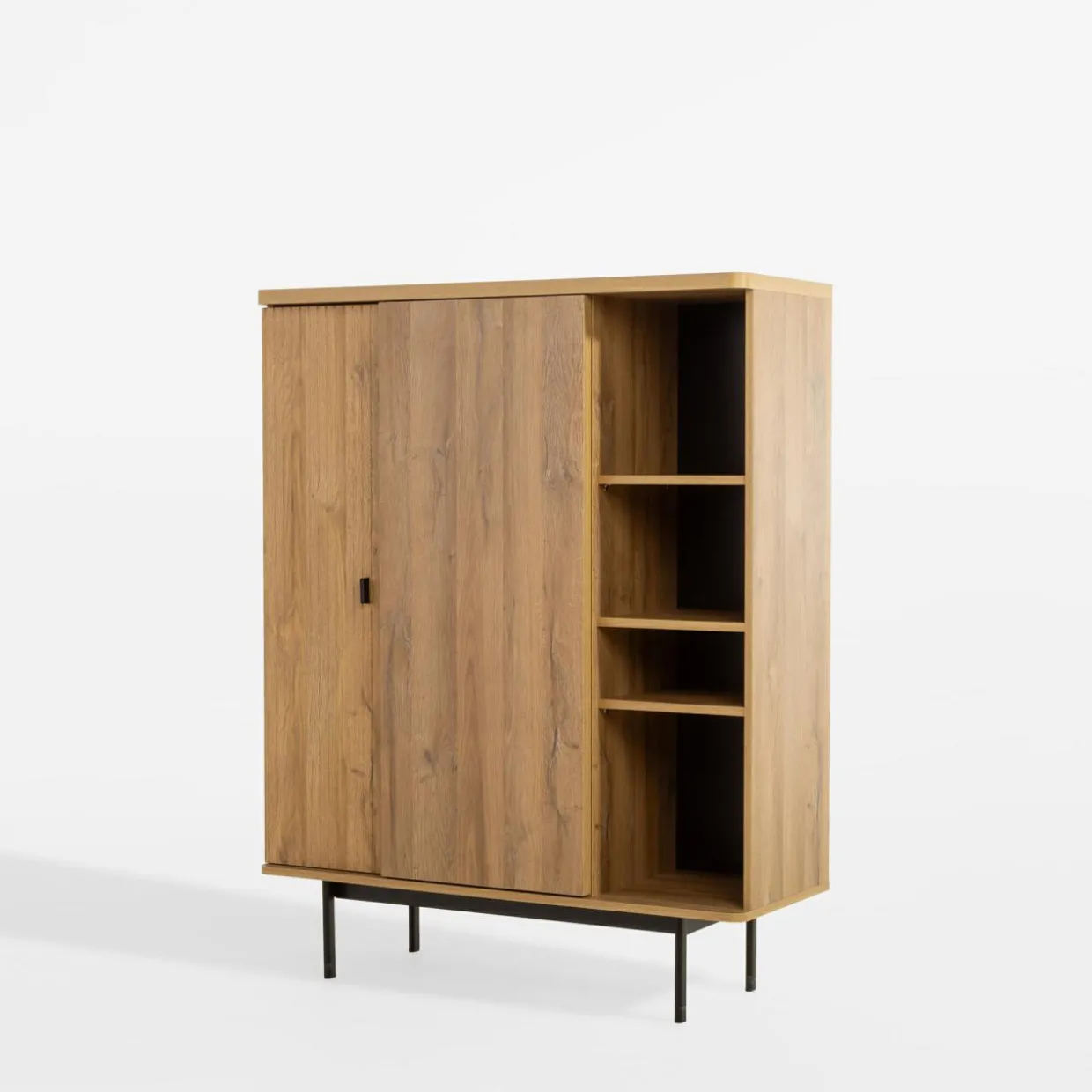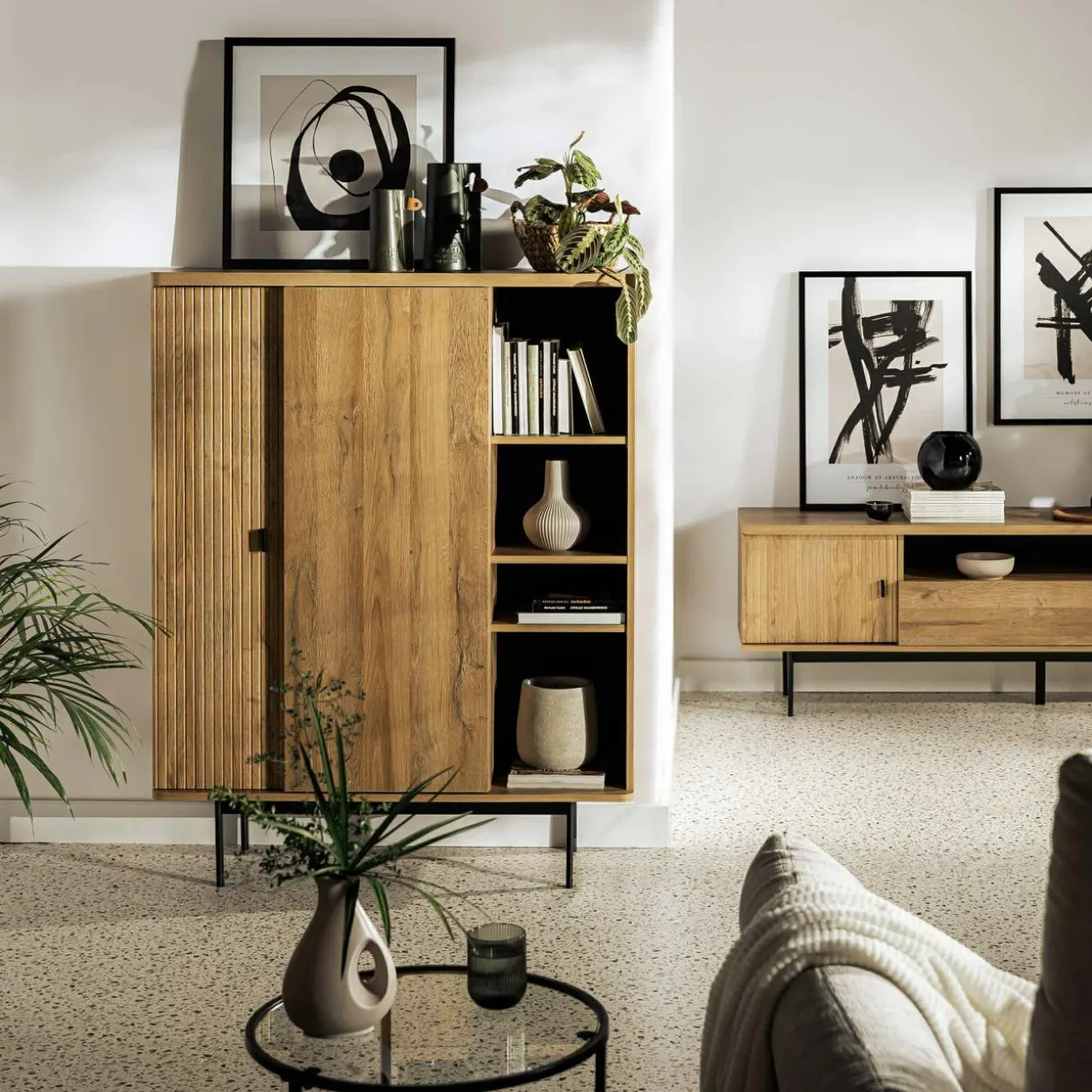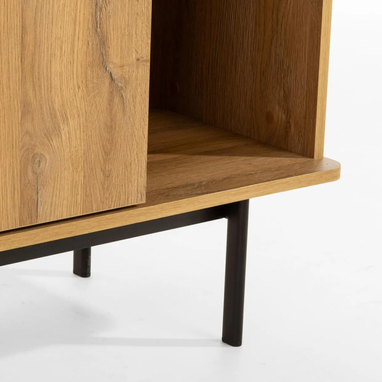 Uporządkuj salon dzięki 2-drzwiowej komodzie LUCIA. Rzeczy nieprzeznaczone na widok schowasz za pełnymi drzwiami, zapewniając schludny wygląd pomieszczenia. Otwarte półki pozwolą Ci wyeksponować ulubione pamiątki z wakacji.