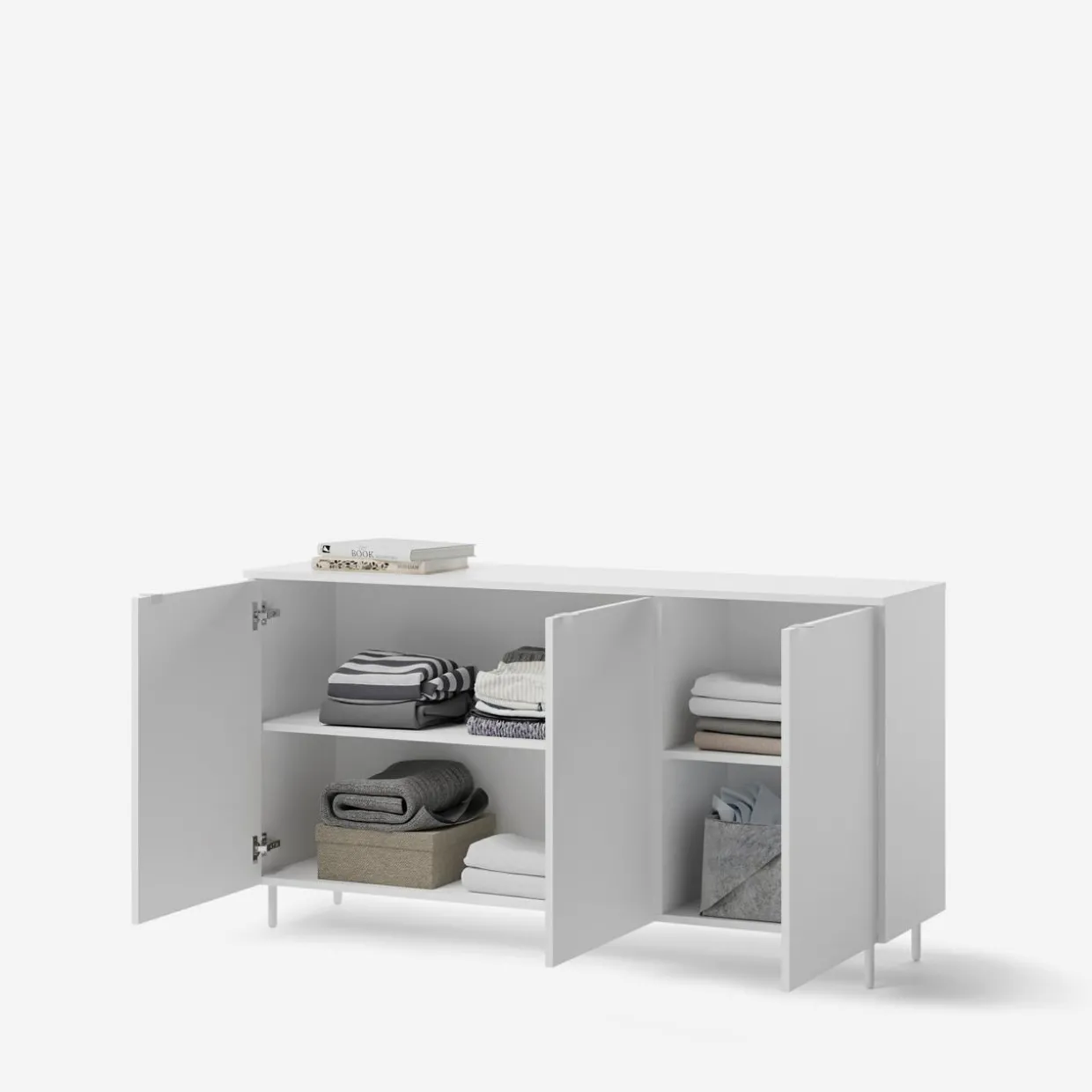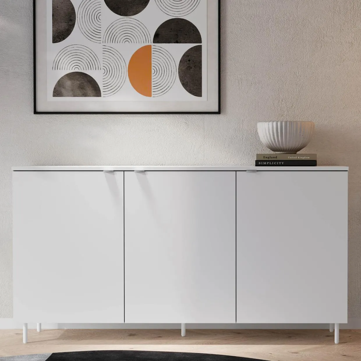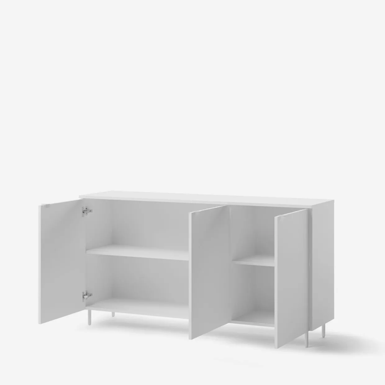 Komoda 3-drzwiowa MILA w białym wykończeniu na metalowych nóżkach to nowoczesny mebel, który świetnie wpisuje się w przestronne i minimalistyczne aranżacje. Jej prosty design i uniwersalny kolor doskonale współgrają z jasnym drewnem, szarościami oraz akcentami w kolorze czarnym lub pastelowym.