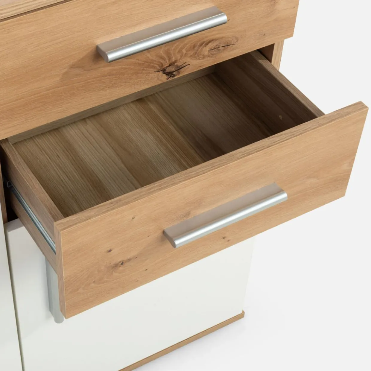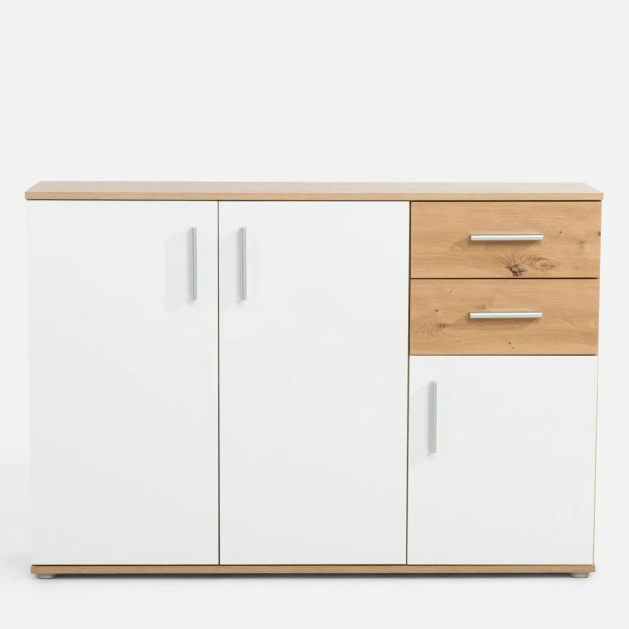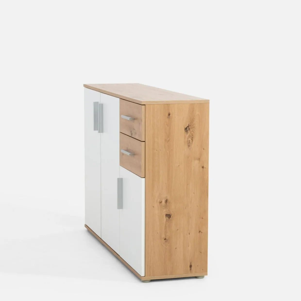 Komody IKOLI łączą nowoczesny design z praktycznym przechowywaniem. Jasne fronty i korpus w odcieniu dębu artisan dodają wnętrzu lekkości. Różne układy – od prostych dwudrzwiowych modeli po warianty z szufladami – sprawdzą się w salonie, sypialni czy biurze.