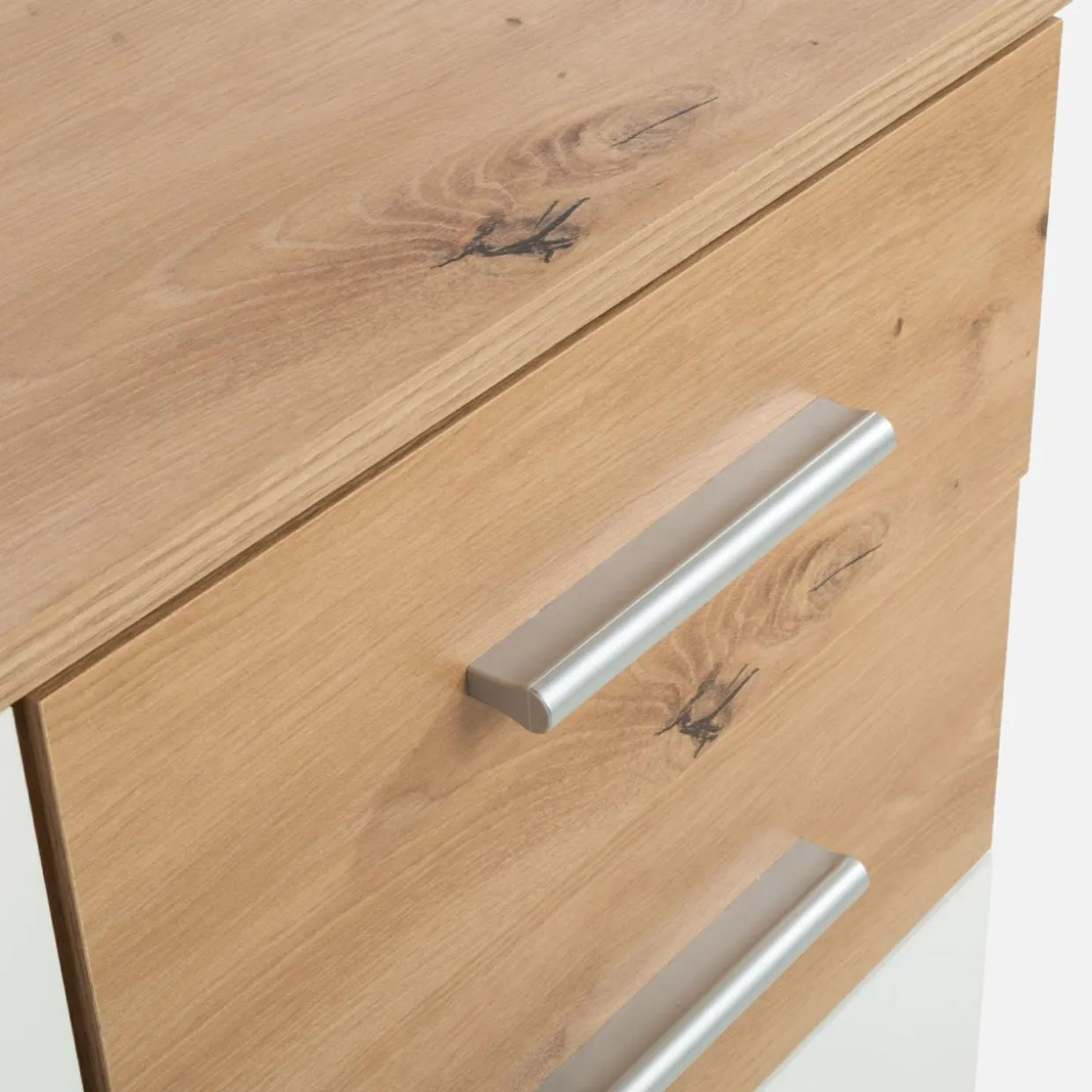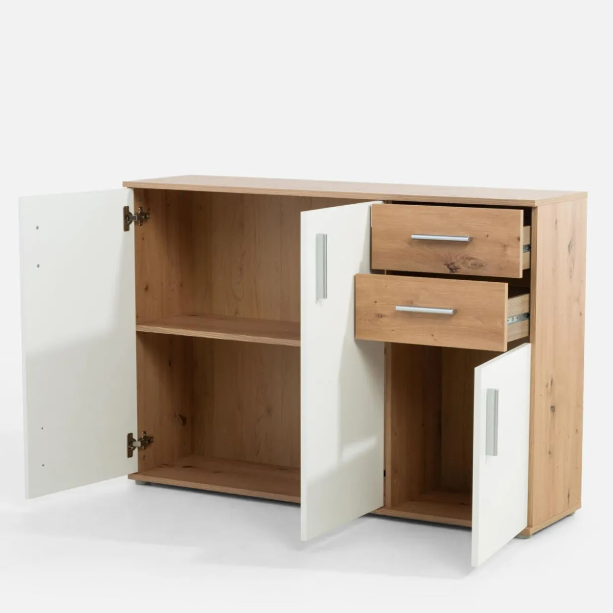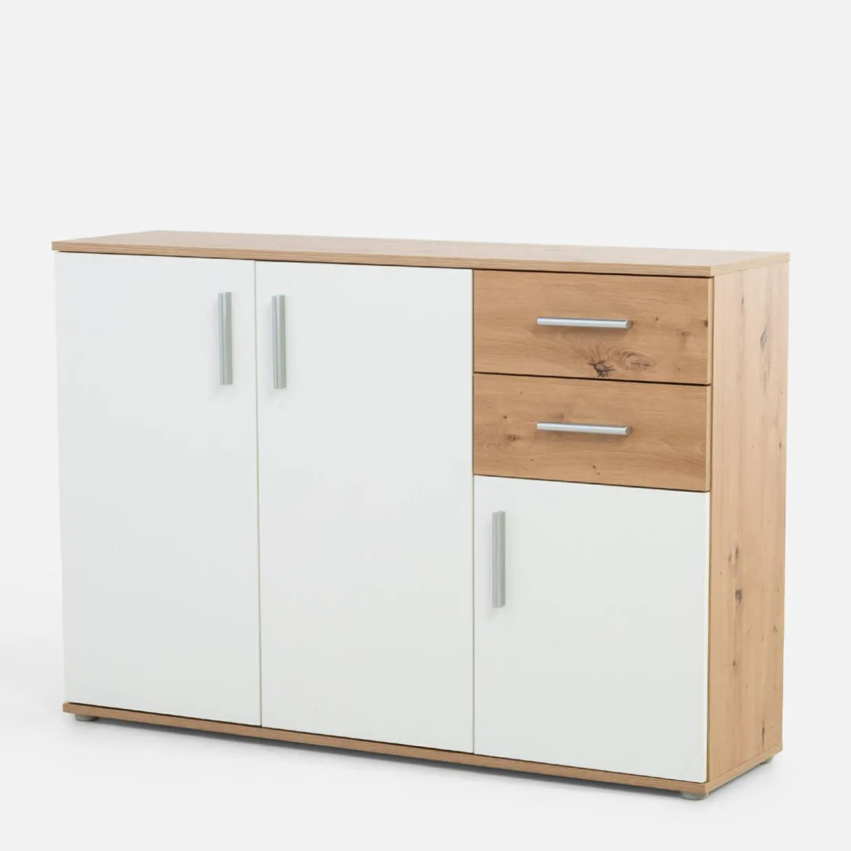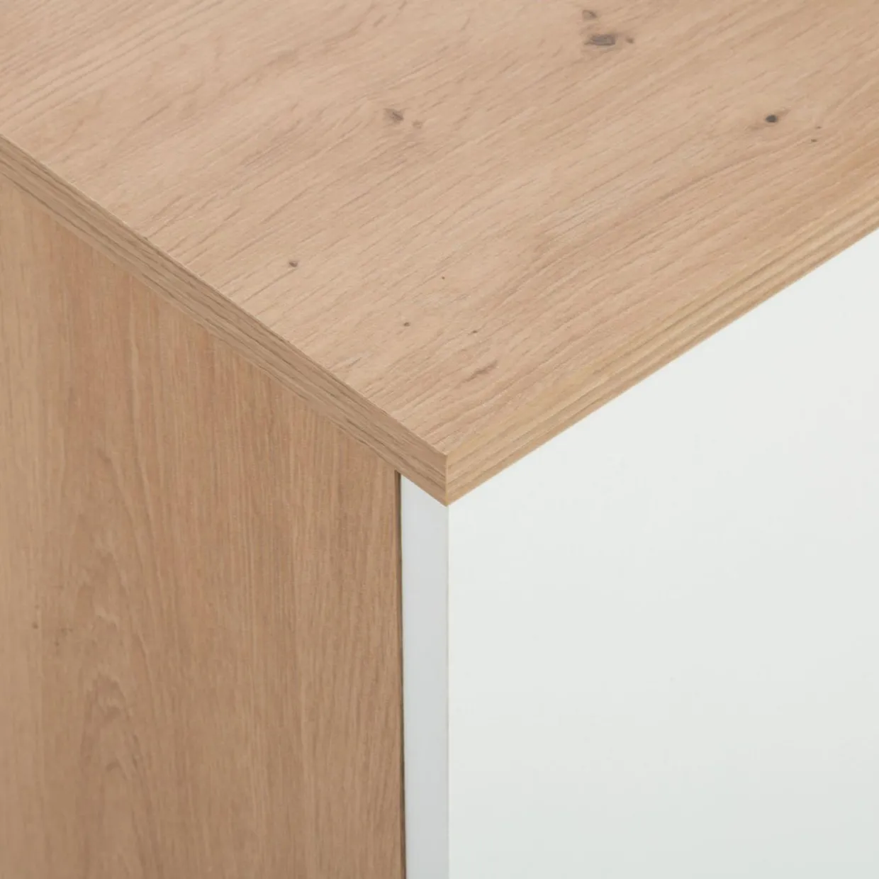 Komody IKOLI łączą nowoczesny design z praktycznym przechowywaniem. Jasne fronty i korpus w odcieniu dębu artisan dodają wnętrzu lekkości. Różne układy – od prostych dwudrzwiowych modeli po warianty z szufladami – sprawdzą się w salonie, sypialni czy biurze.