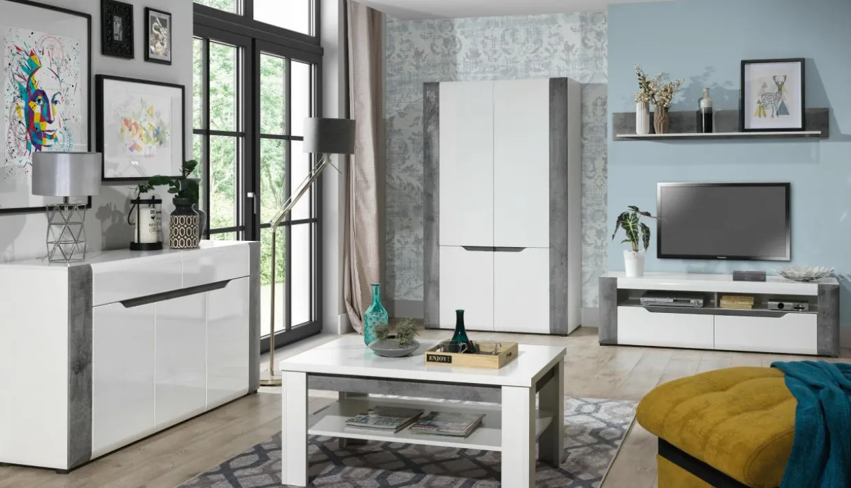 Korpus oraz blaty mebla zostały wykonane z laminowanej płyty meblowej, natomiast fronty to MDF z wykończeniem w białym połysku. Modne zestawienie bieli oraz szarości betonu dodaje komodzie BRANDO nieco surowości złagodzonej poprzez linię podchwytów we frontowej części mebla.