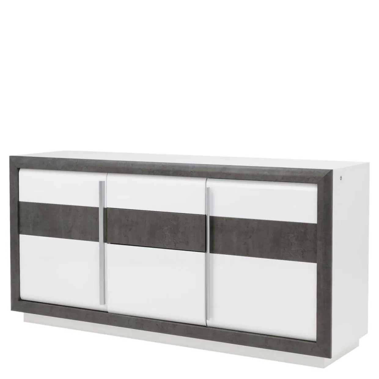 Komoda cechuje się masywną ramą, która najbardziej zwraca na siebie uwagę. Wydaje się okalać całą bryłę i jeszcze bardziej podkreśla trójwymiarowość. Kolejnym wyróżniającym elementem są pionowe i długie uchwyty w kolorze aluminium.