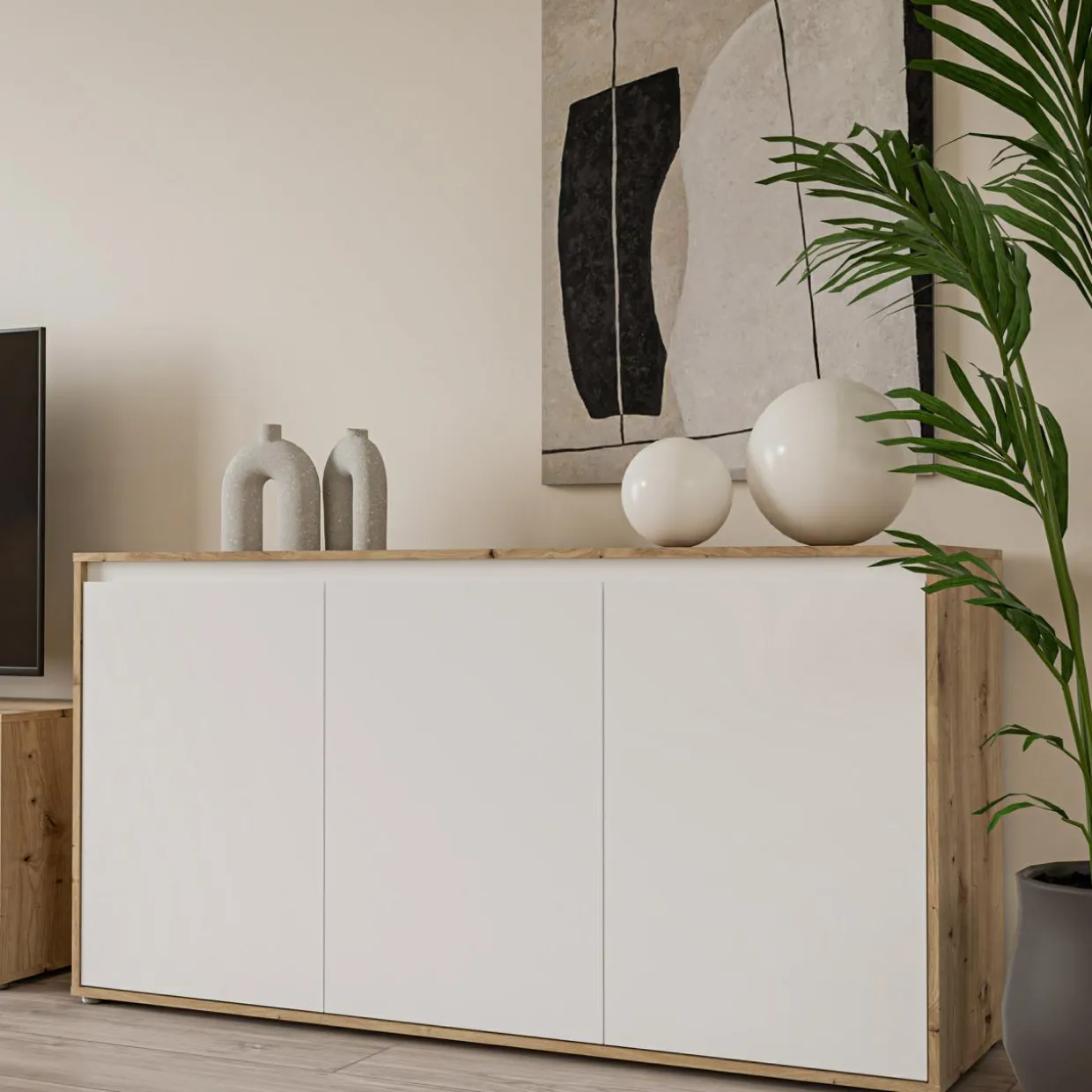 - Ponadczasowa kolorystyka — biało-drewniane wybarwienie będzie pasować zarówno do nowoczesnych wnętrz, ale także skandynawskich, japandi i boho modern.