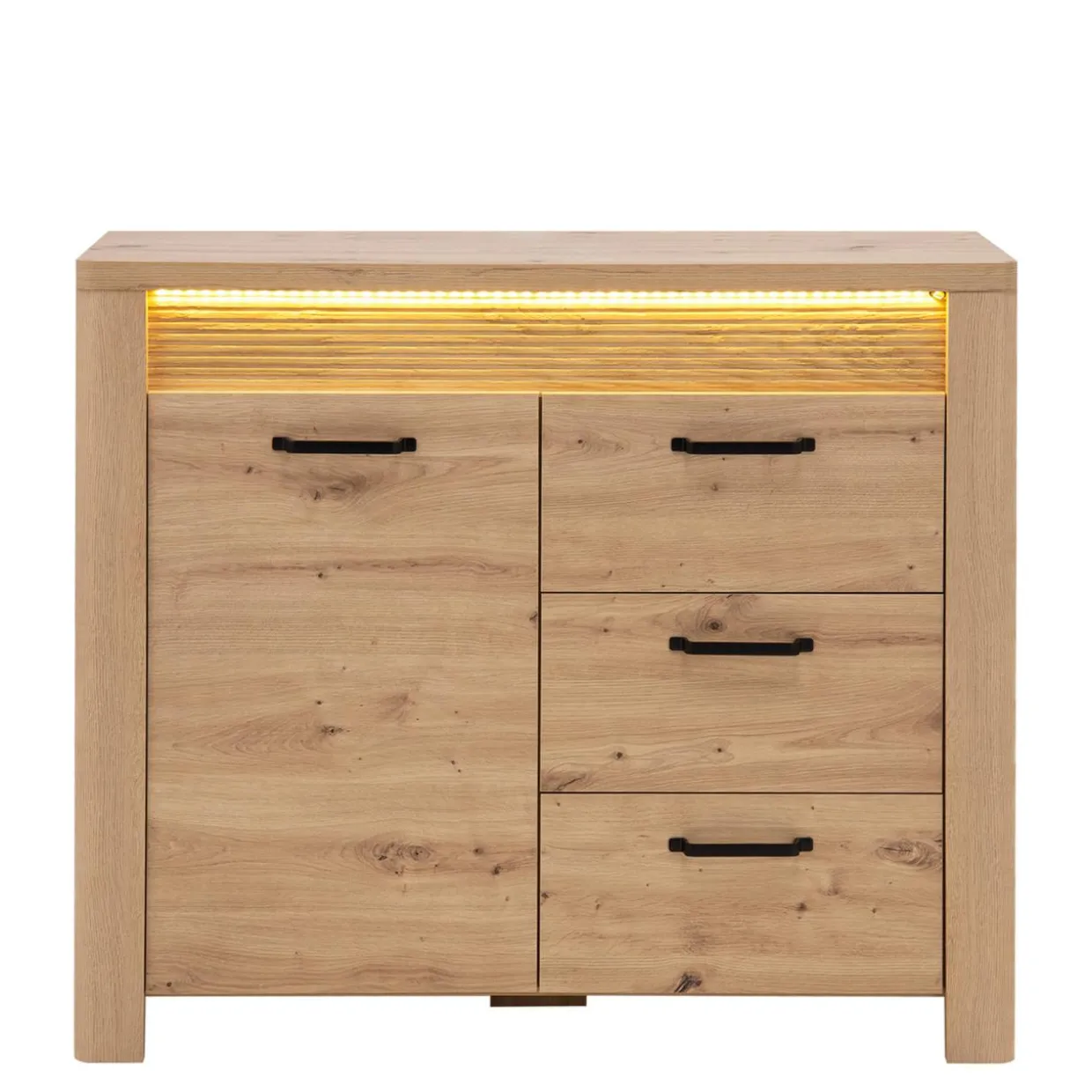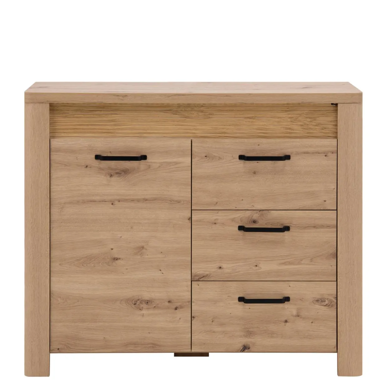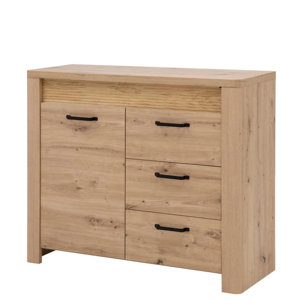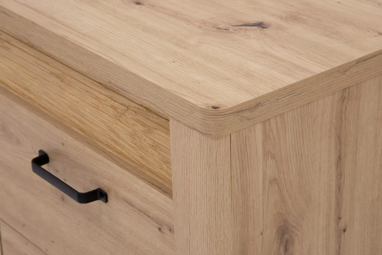 Komoda MORIS posiada trzy szuflady oraz otwieraną szafkę z półką – idealne rozwiązanie pod kątem umieszczenia w nich ubrań, dokumentów lub przydatnych przedmiotów osobistych.
