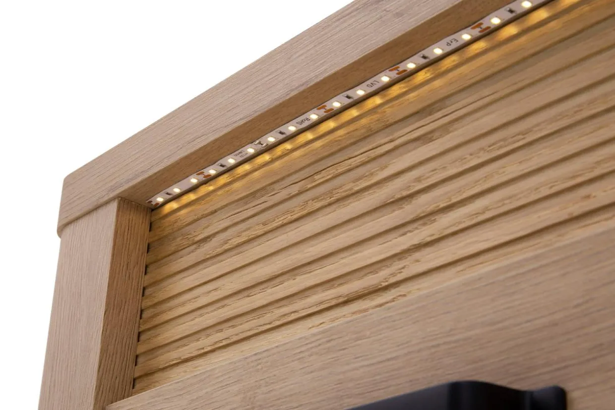 Komoda MORIS posiada oświetlenie LED umieszczone przy ozdobnej części mebla pomiędzy blatem a szafką i szufladami.