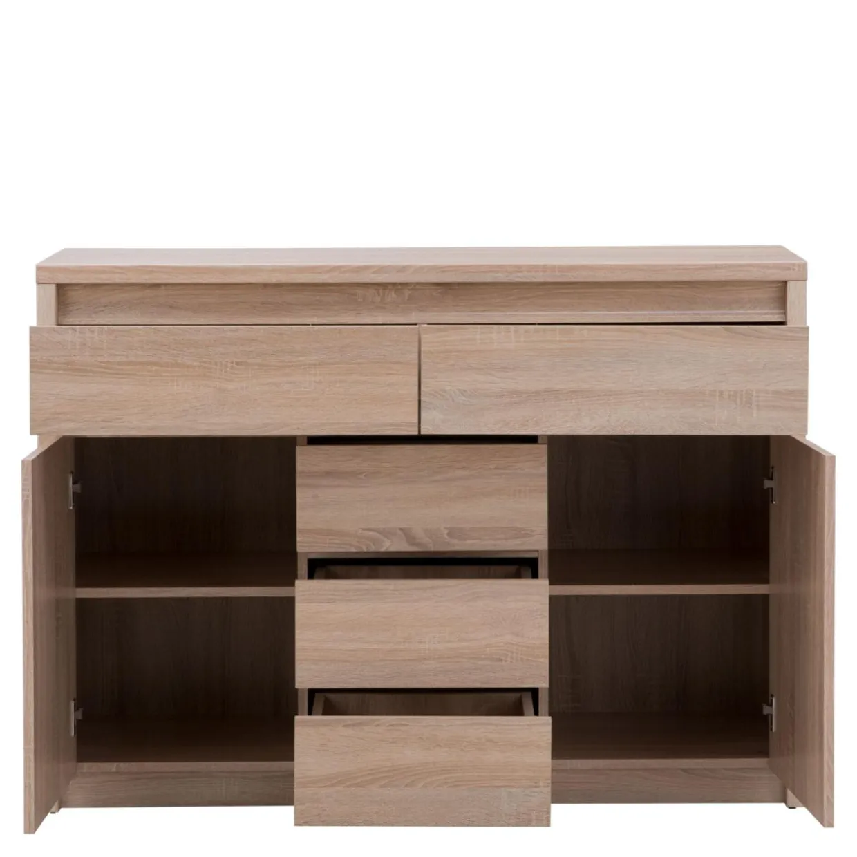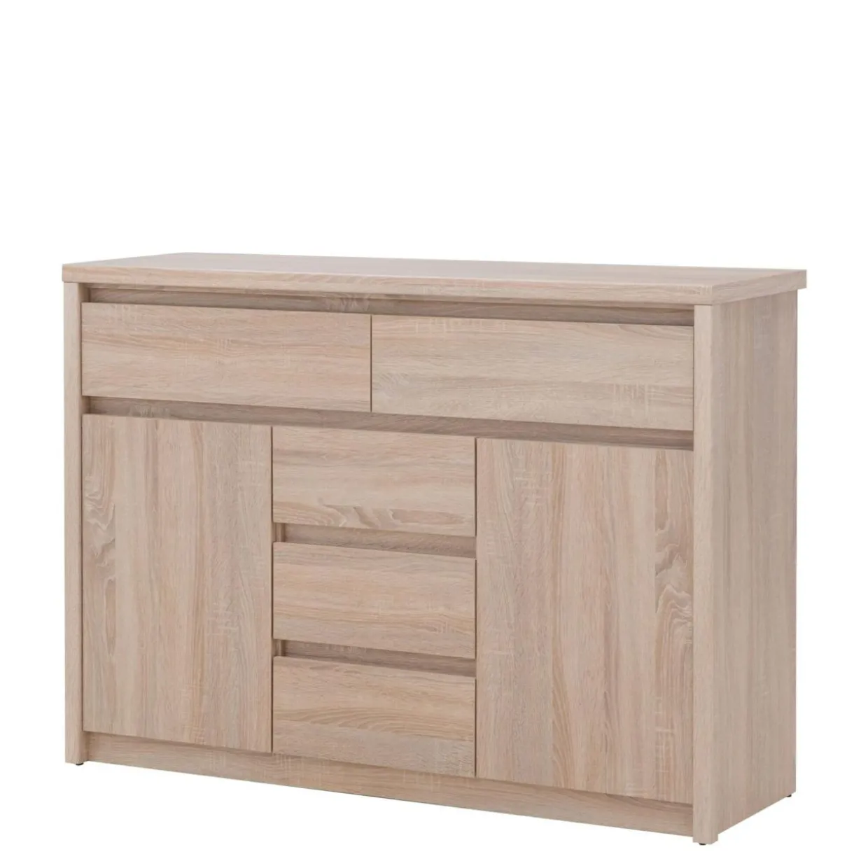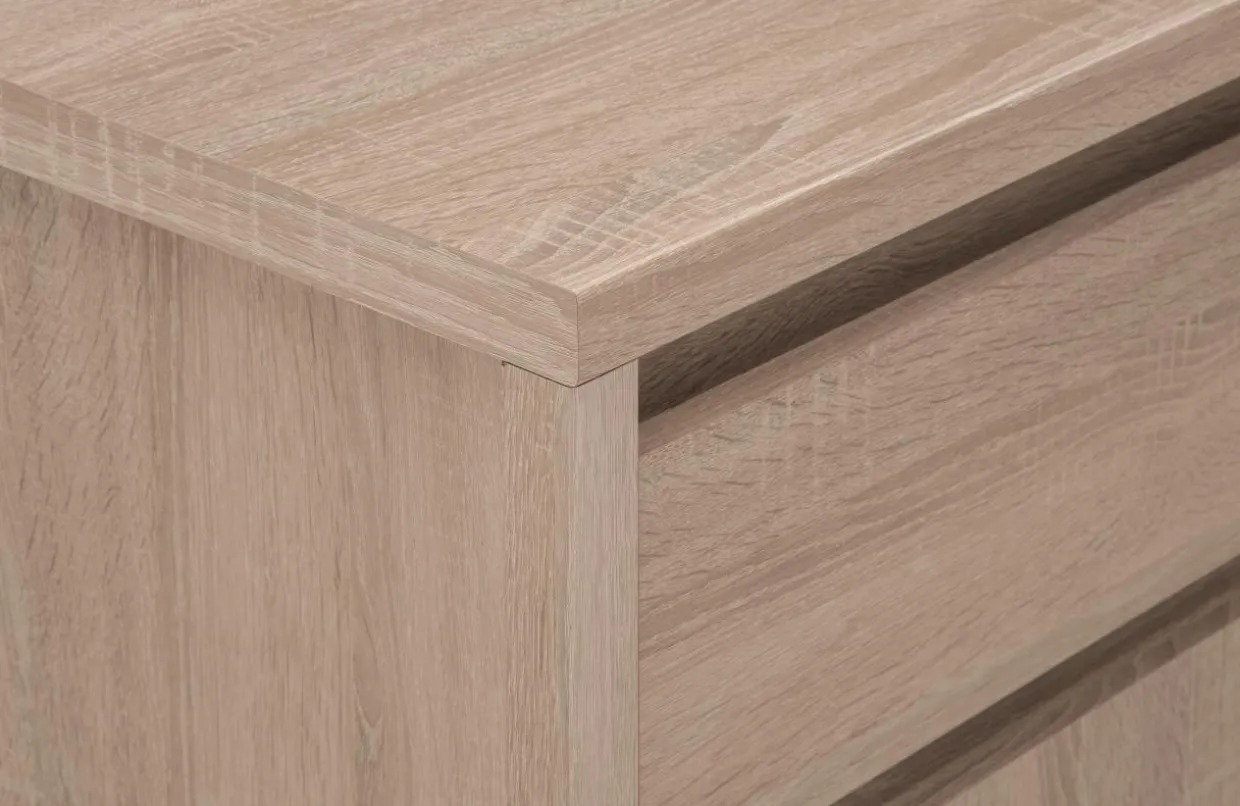 Komoda NORTON charakteryzuje się prostą minimalistyczną formą, która sprawia, że mebel pasuje do nowoczesnych wnętrz. Laminat w jasnym kolorze dębu sonoma, dekorem przypominający drewno, wprowadzi do pomieszczenia przytulny klimat. Brak tradycyjnych uchwytów sprawia, że mebel łatwiej wkomponować w dowolną aranżację.