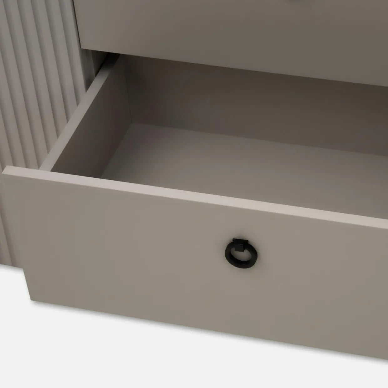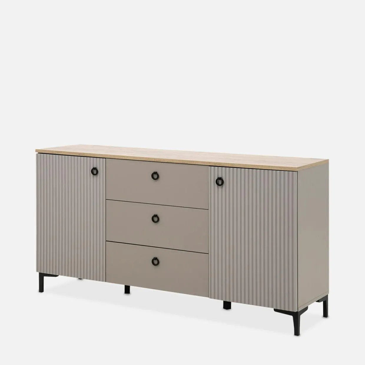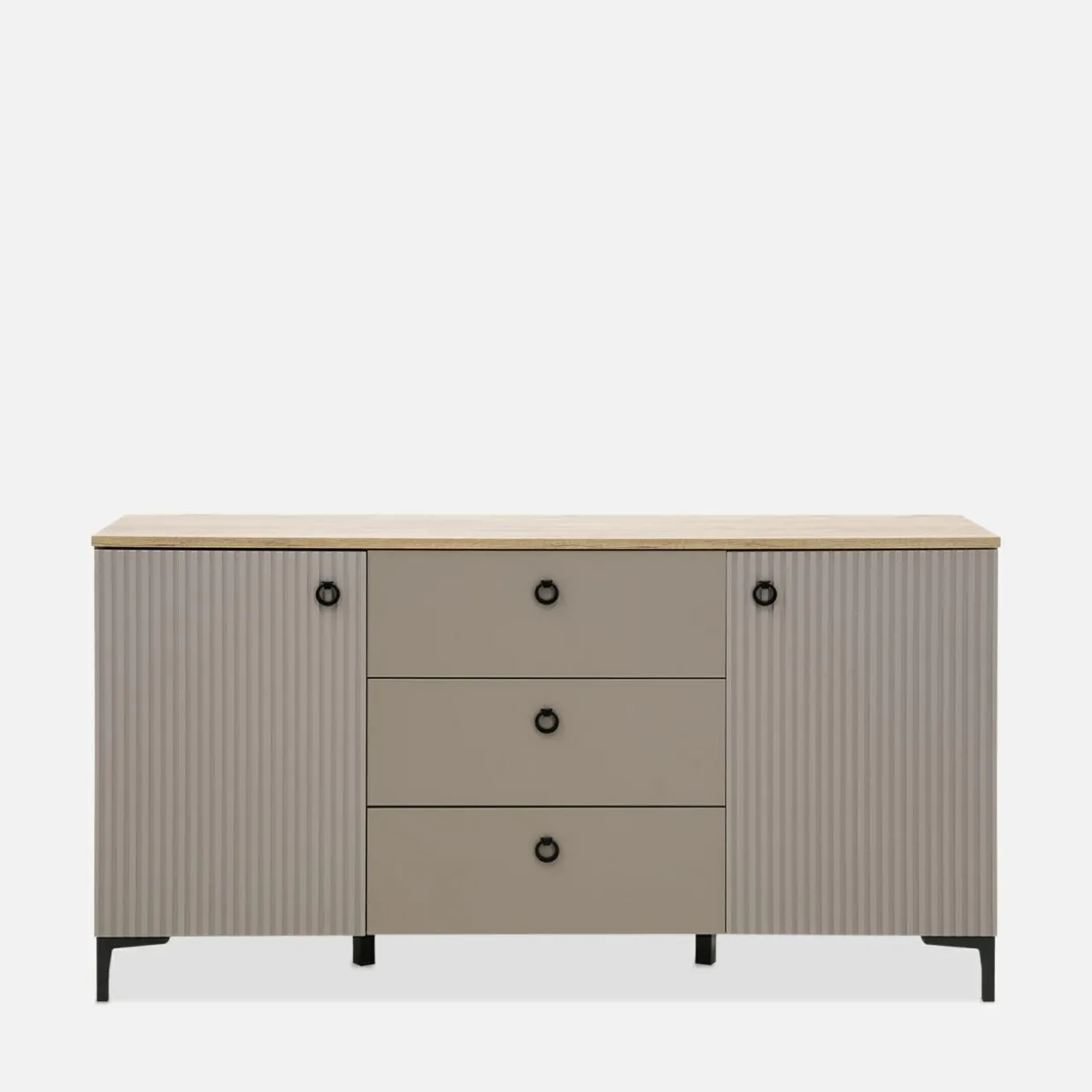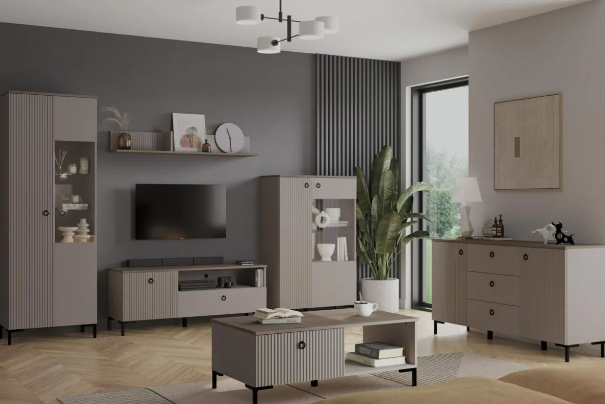 - Ryflowane fronty w kolorze taupe idealnie zgrywają się z korpusami. Wykończone są laminatem i folią.