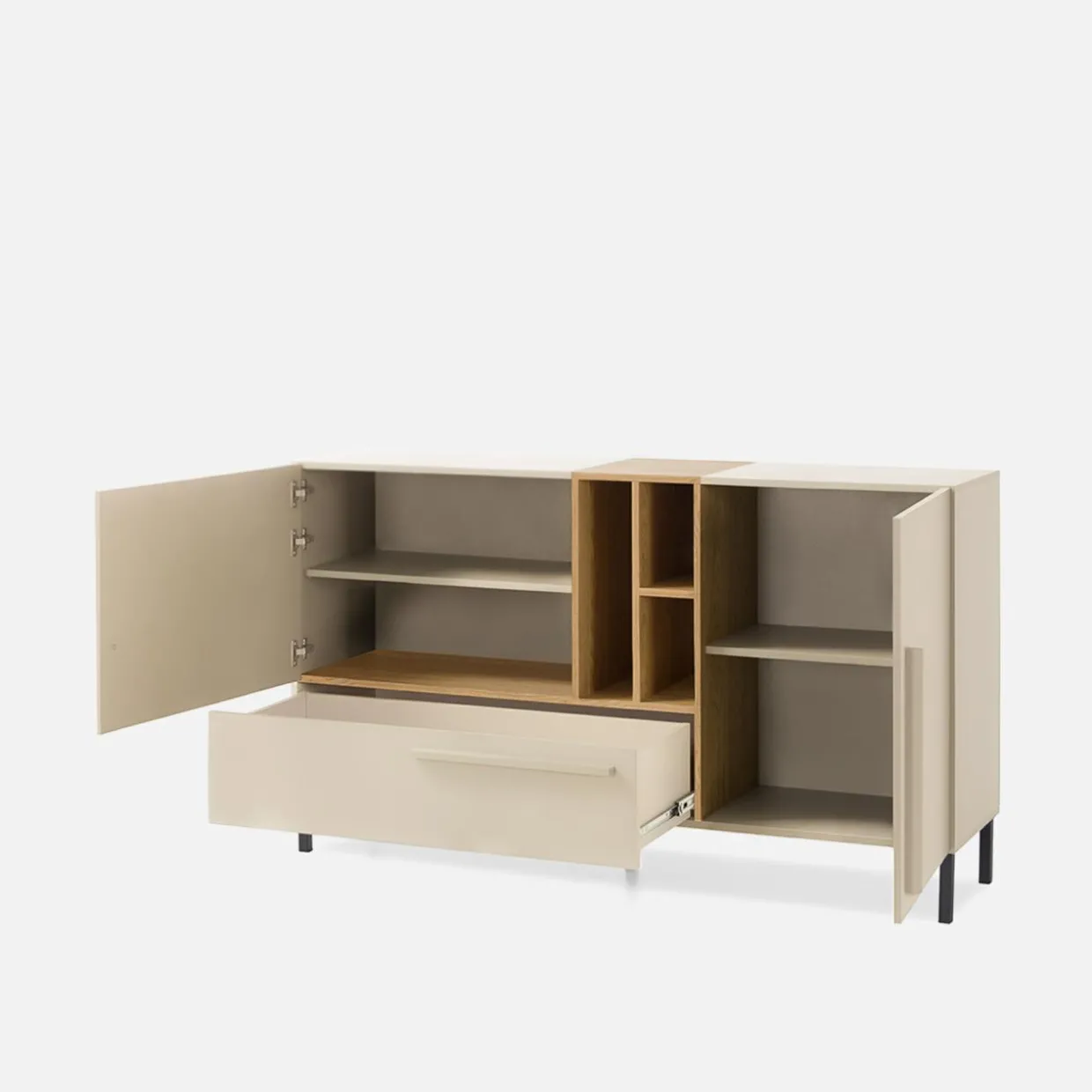 - W kolekcji znajdują się meble w 3 wybarwieniach. Jasny beż piaskowy przełamuje kolor dębu olejowanego i granatu królewskiego. Wyraźne elementy uwydatniają delikatny odcień, podkreślając ciepło i elegancję.