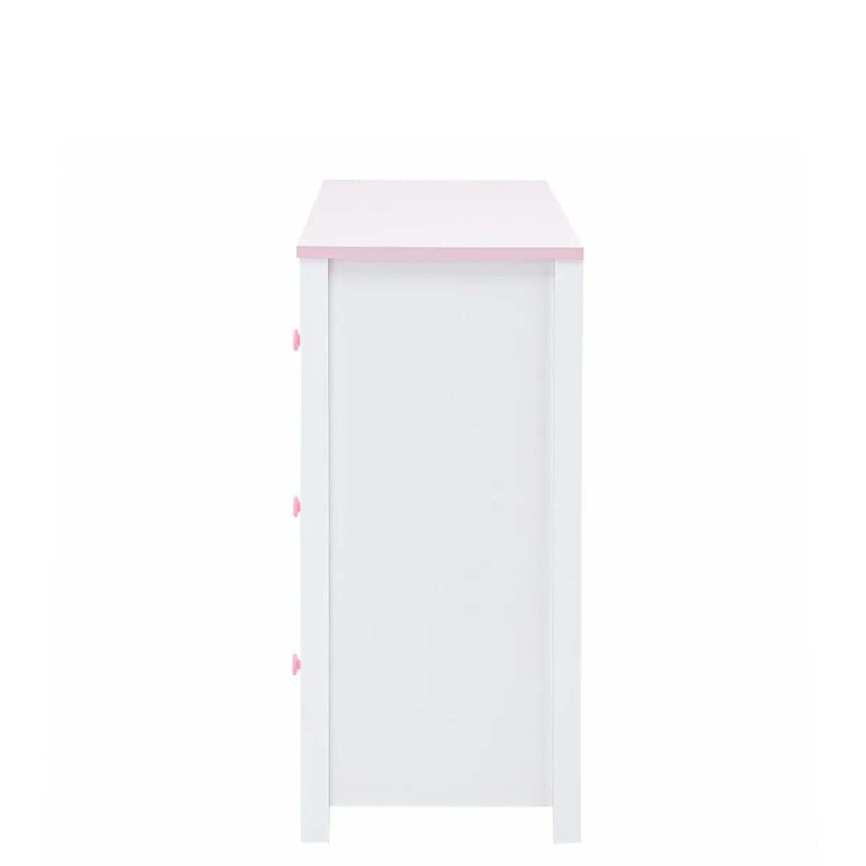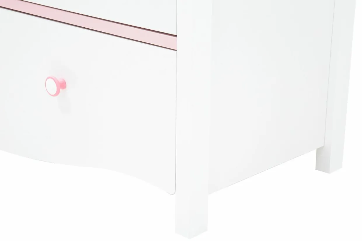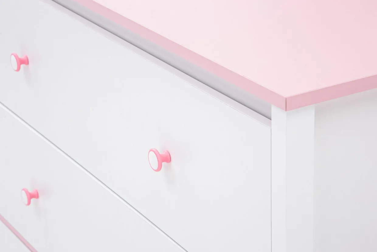 - Szuflady posiadają różowe uchwyty z tworzywa, które stanowią element dekoracyjny, a dodatkowo dostosowane się do mniejszych dziecięcych rąk. Dzięki uchwytom Twoje dziecko samodzielnie otworzy szufladę, co ułatwi mu utrzymanie porządku w pokoju.