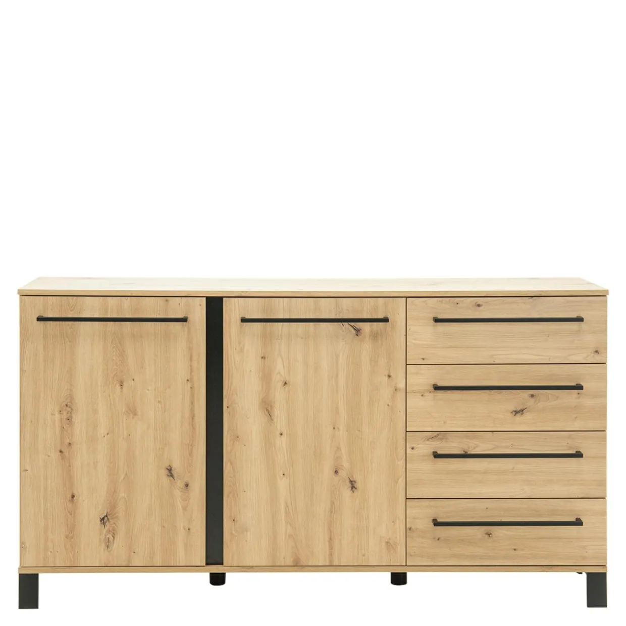 Dzięki komodzie SOFIA zyskasz dodatkowe miejsce na akcesoria domowe. Stylowe wykończenie w kolorze dąb artisan w połączeniu z czarnymi, metalowymi uchwytami wpasuje się w aranżacje w stylu industrialnym.