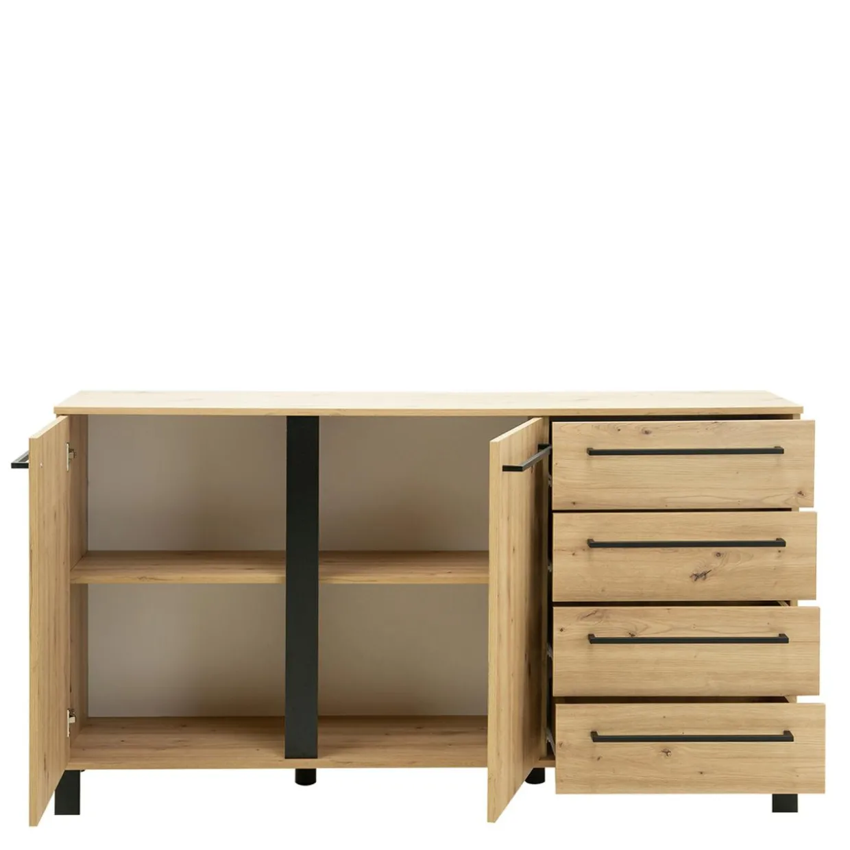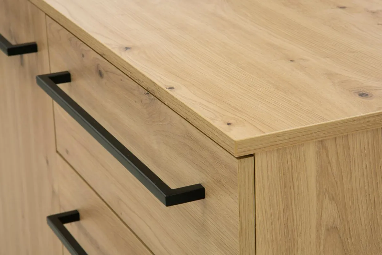 - Połączenie dębu artisan z metalowymi, czarnymi uchwytami sprawia, że mebel będzie idealnym dopełnieniem wnętrz w stylu industrialnym.