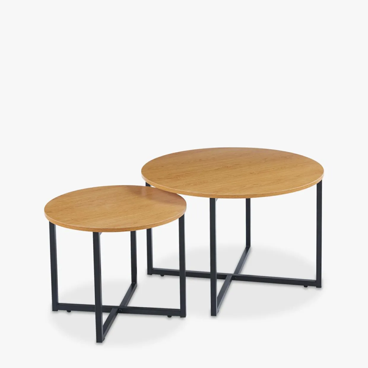 Komplet 2 okrągłych stolików KARMONY odnajdzie się w salonie, zapewniając Ci miejsce do pracy z laptopem czy na zjedzenie szybkiego lunchu. Prosta konstrukcja stolików oraz ich metalowe krzyżowane nogi podkreślą nowoczesny i loftowy styl wnętrza.
