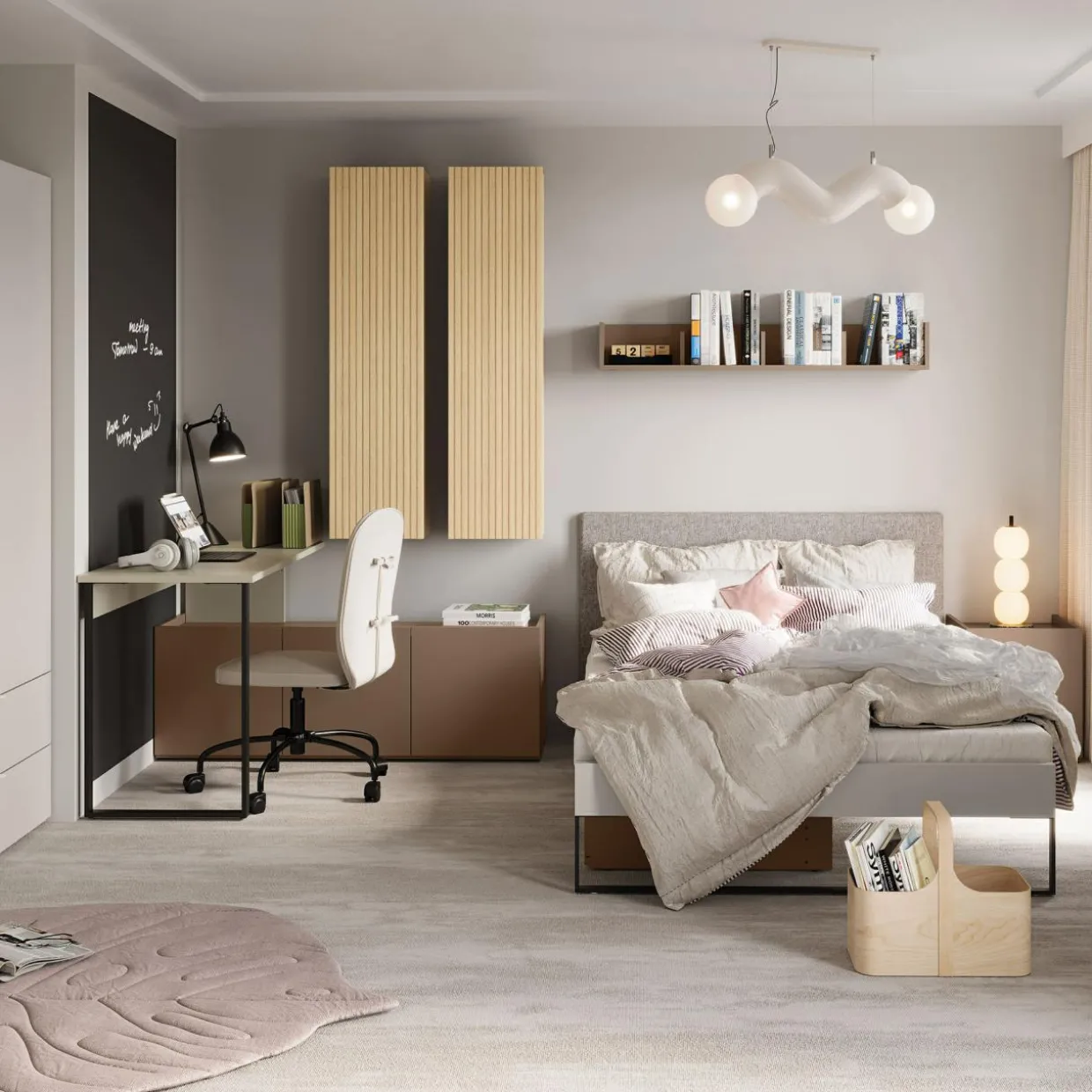 Otocz się ciepłem kaszmirowego beżu z kolekcji SIGMA. Gładkie fronty wprowadzą do Twojej sypialni subtelną, spokojną i aurę, tworząc miejsce do codziennego wypoczynku. Elementy w kolorze jasnego dębu i truflowego brązu tworzą ciekawy, przełamujący akcent.