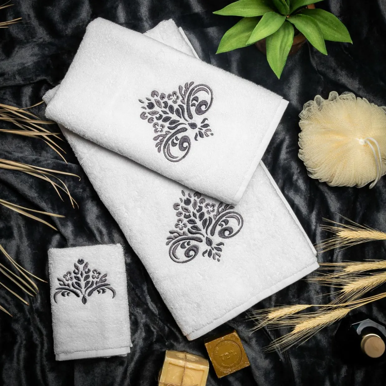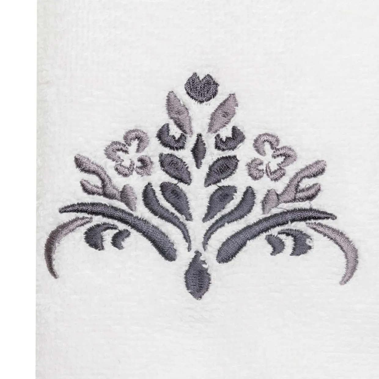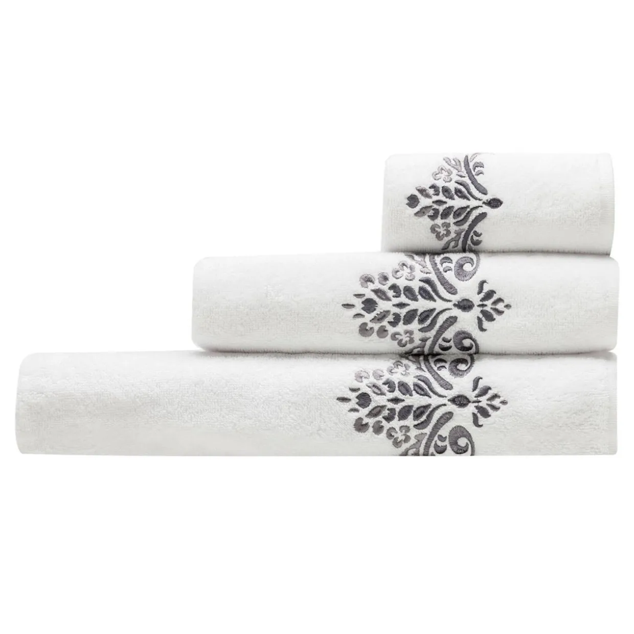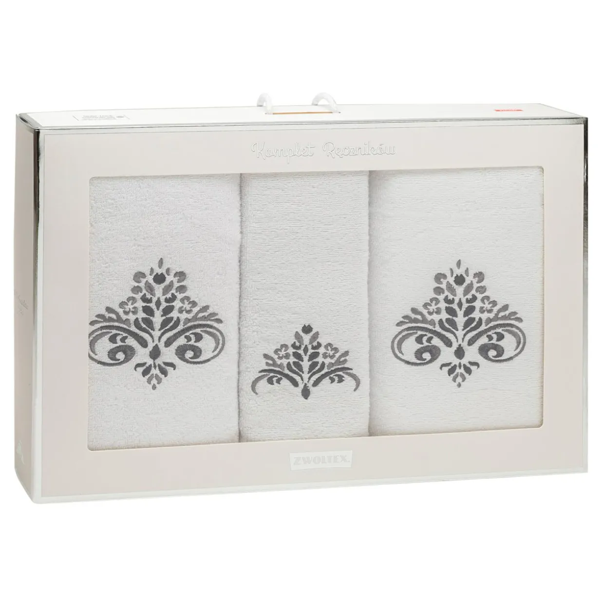 Komplet 3 ręczników w klasycznym kolorze z ozdobnym wzorem, wpasuje się w większość rozwiązań aranżacyjnych.
