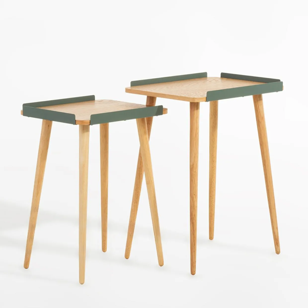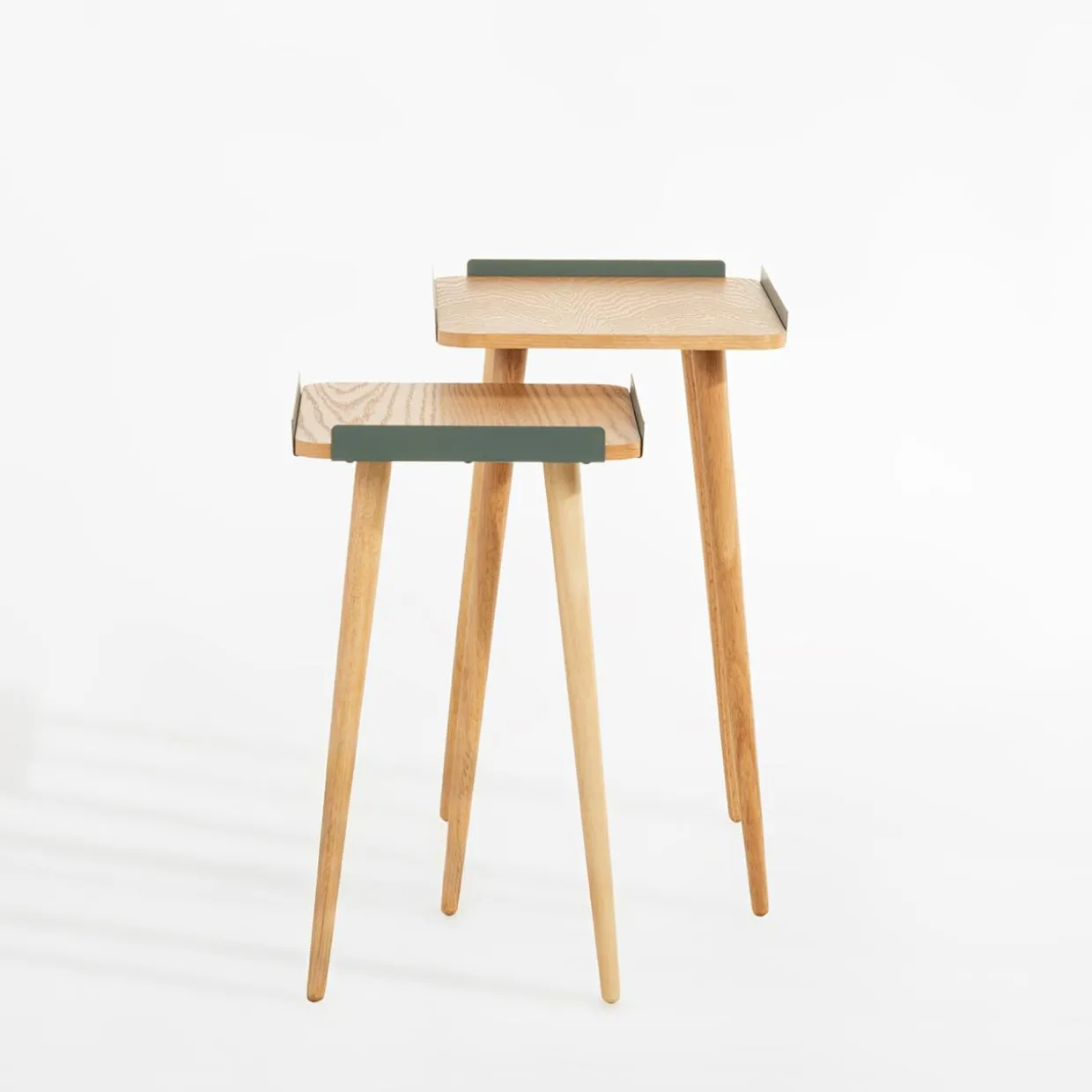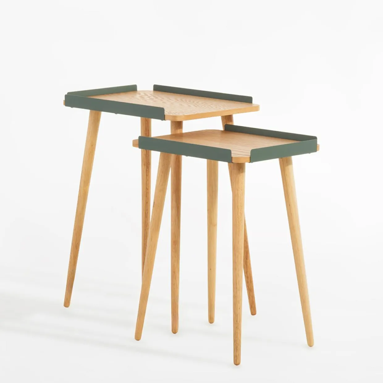 Komplet stolików NOCETTO wyróżnia naturalnymi materiałami – nogi są wykonane z prawdziwego drewna kauczukowego, natomiast blat wykończono fornirem dębowym, dzięki czemu zawdzięcza naturalny rysunek drewna.