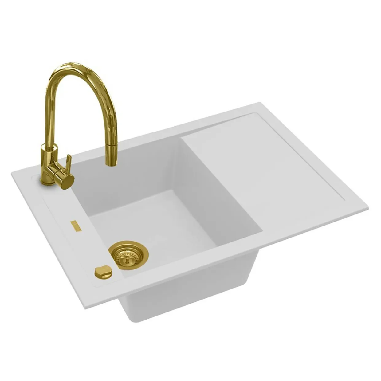 Zlewozmywak FLIN ROYAL w białym kolorze oraz specjalnie dobrana do niego bateria QUEEN o złotym wykończeniu zostały zaprojektowane w nowoczesnym stylu, który łączy elementy estetyczne z funkcjonalnymi.