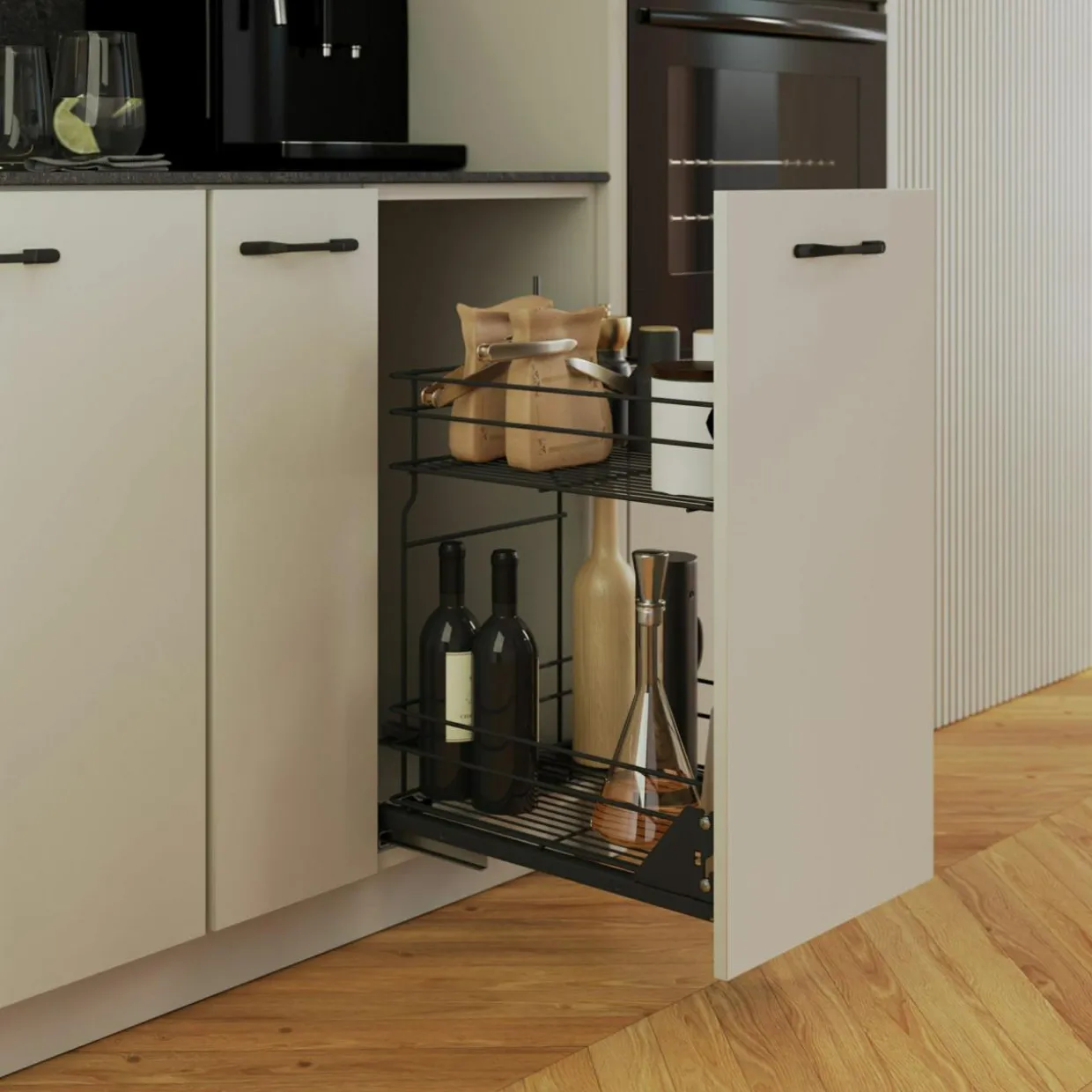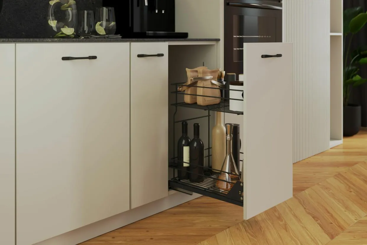 Wysuwane, pionowe szuflady, ruchome koszyki, czy półki montowane w szafkach narożnych to elementy, które pozwalają w intuicyjny sposób wykorzystać przestrzeń i skutecznie nią zarządzać.